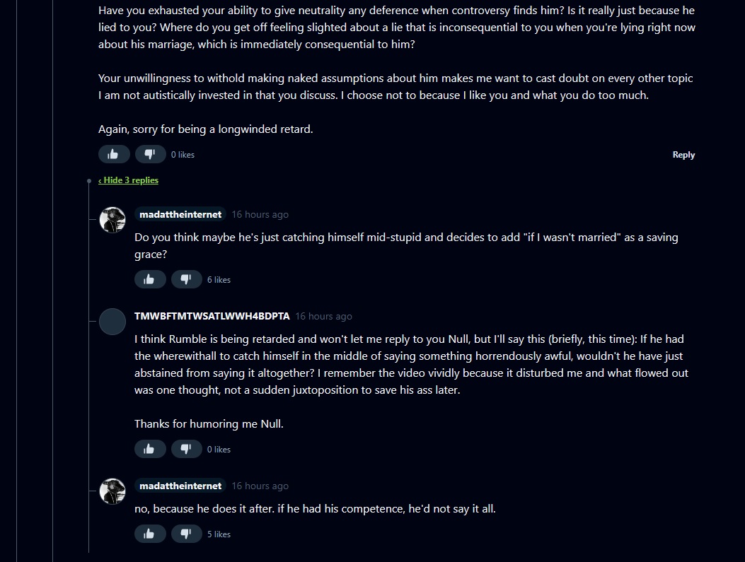 Someone in the Rumble comments confronts Null about his takes on Rekieta ("It's clear to me he takes his vows seriously and that he seriously loves his wife and kids"), Null doubles down, claims to have special secret knowledge of Rekieta's relationship with his wife being "not as rosy as you hope" (and how does Null know this?) and then proceeds to micromanage the responses of his former not-friend: