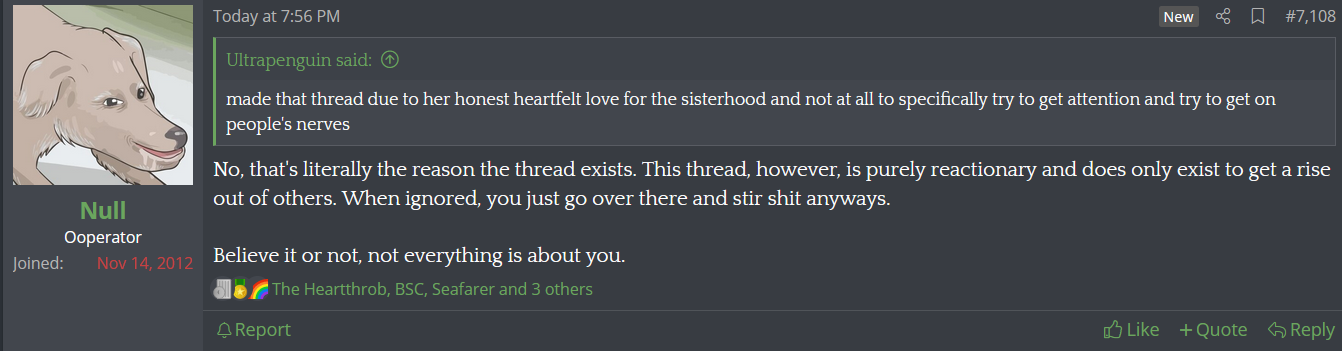 It is the biggest problem with Kiwifarms is that it has turned in to Null and friends. The site was at its best when it used to be a bunch of smaller communities of people shitpositng instead of being a cult. Each board and thread used to be it's own beast now everywhere you go it feels like you are posting on the guntboard where the members are unhinged lunatics and the moderators are total discord fags that get away with anything as long as they keep sucking Null off.