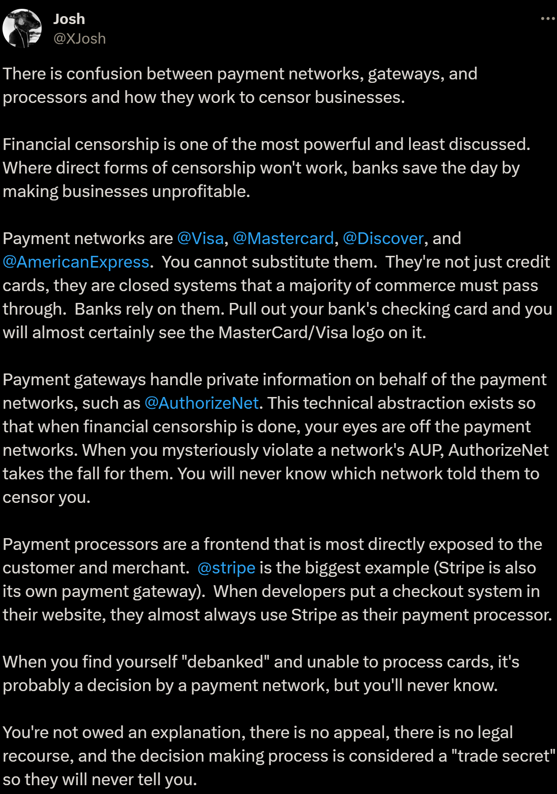 Long rant about payment processors. This basically just comes down to a tantrum that he can't have his way. SHAMEFUR DIRPLAY