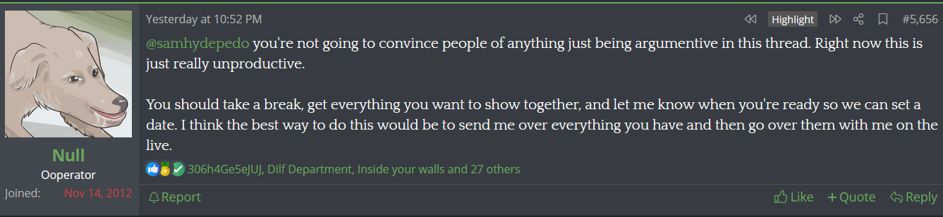 A person joins Kiwi Farms accusing Sam Hyde of being a groomer and wanting to do an interview with Null on MATI to reveal everything. Null hesitates out of fear Hyde's fans will attack him.