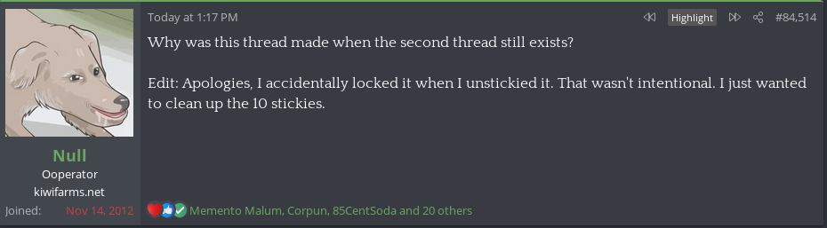 lmao I hope he banned that faggot to teach him a lesson. Time does not heal all wounds when it comes to a ban happy retard and their discord clique actively looking to ban you every time you show up. Banning those fuckers back (thanks keffals. keep banning this fucking retard. Its very cathartic) and finding a place you can actually post in and come back to without worrying about being randomly permabanned on a whim by the next day does.Never change Null. Even well on your way to 40 years old you still can't admit when you are wrong.