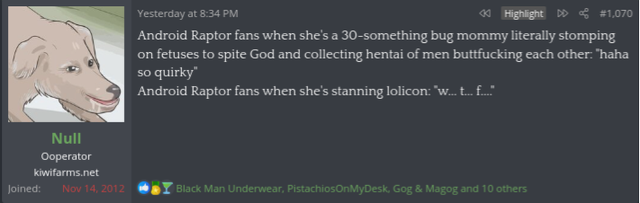Once I realized that Android Raptor has been doing things for a decade that get other users banned immediately I figured out this is just their dysfunctional way of flirting.Dunking on oldfag Android Raptor for her take on lolicon: