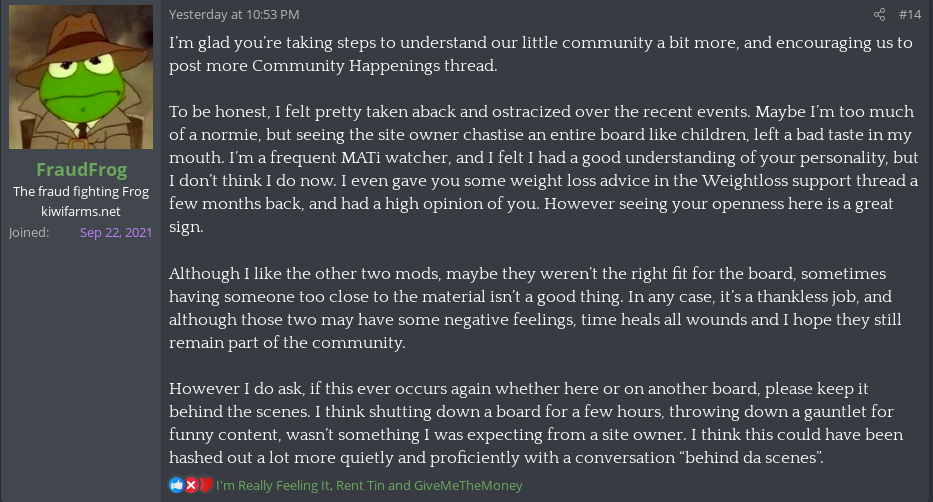 Also he seems to be backtracking a little here promising to read the DSP board more and removing the guy he set as mod. He probably realised if he doesn't smarten the fuck up that DSP splinter site is going to nuke a good portion of his active users.