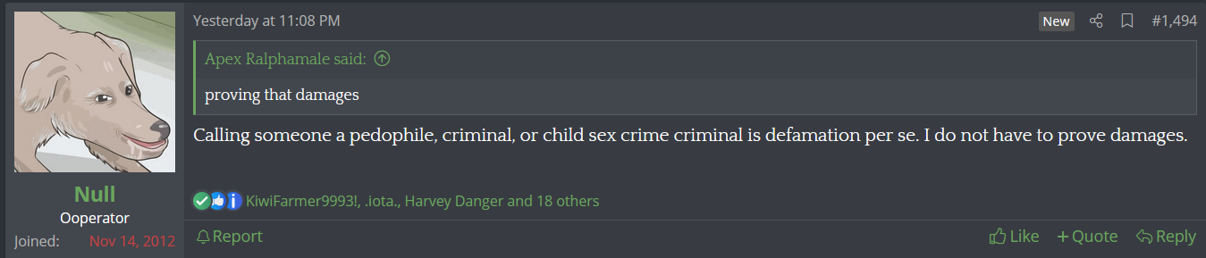 The entire reason a lot of defamation cases do not succeed is they can't even prove damages, let alone the other party knowingly lying with intention to do harm, even if what they are saying is untrue. But in null's circumstances of having hosted CP one of his sites it wouldn't even be defamation to assume he is a pedophile based on that because people have been put on a registry for less. If anything drawing attention to it will make everyone realize it's true.