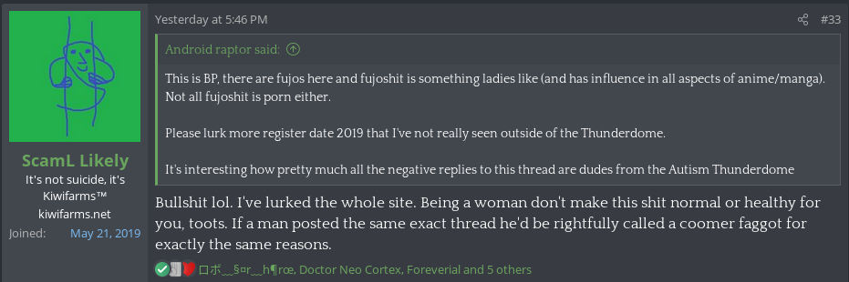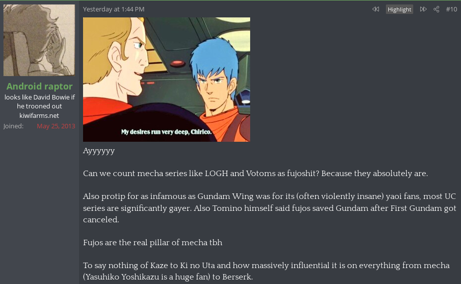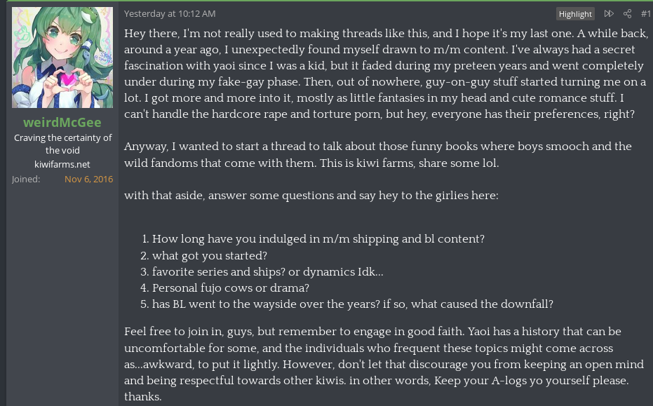 Somebody, not a new poster btw 2016 reg date makes a thread about gay anime and shipping as if to confirm that Null is turning the site into a haven for mentally ill women
