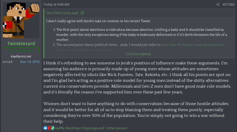With that said, I can understand why he's spouting this nonsense. I'd guess that the kind of degenerate fujoshit women he's courting (and protecting via moderator power) are more likely to paypig for him. Also, as an unmarried and physically repulsive man pushing 40 (right?), I am guessing that a lot of this is just him doing a Kiwi-Farms-ified version of the "male feminist" gambit in order to secure female attention. Sad!