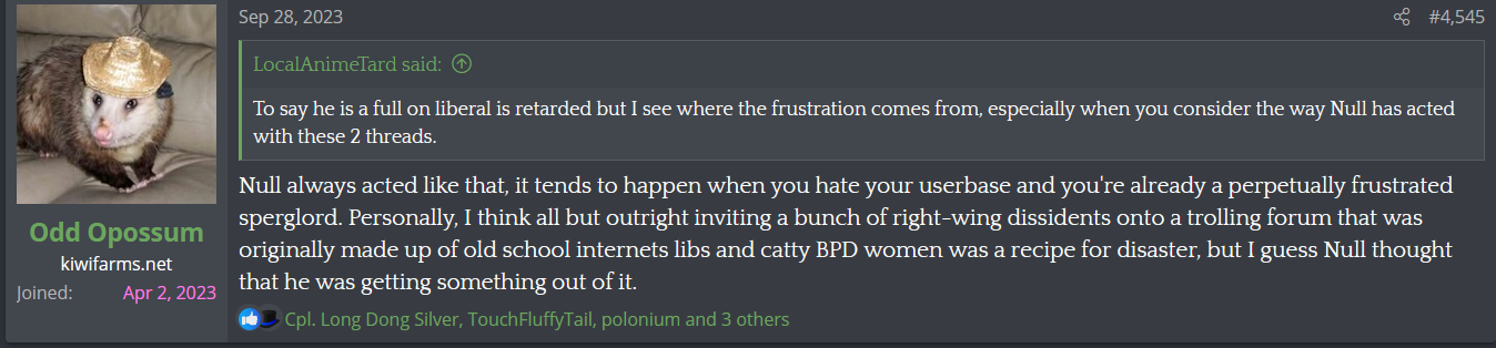 Didn't Null Dox a user because he backtalked Lidl?Additionally, back when the "woman hate" and "man hate" threads were feuding, people would catch a mod action within an extremely short window after they dunked on lidl drip. Much quicker than usual reports.
