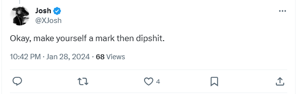 Y'know..., a man with voice like William Smith, Clint Eastwood, Charles Bronson, they could get away with a line like that. joshy's just going to get bullied more... cuz outside of his hugbox... he's a nobody. And they leave mean comments.