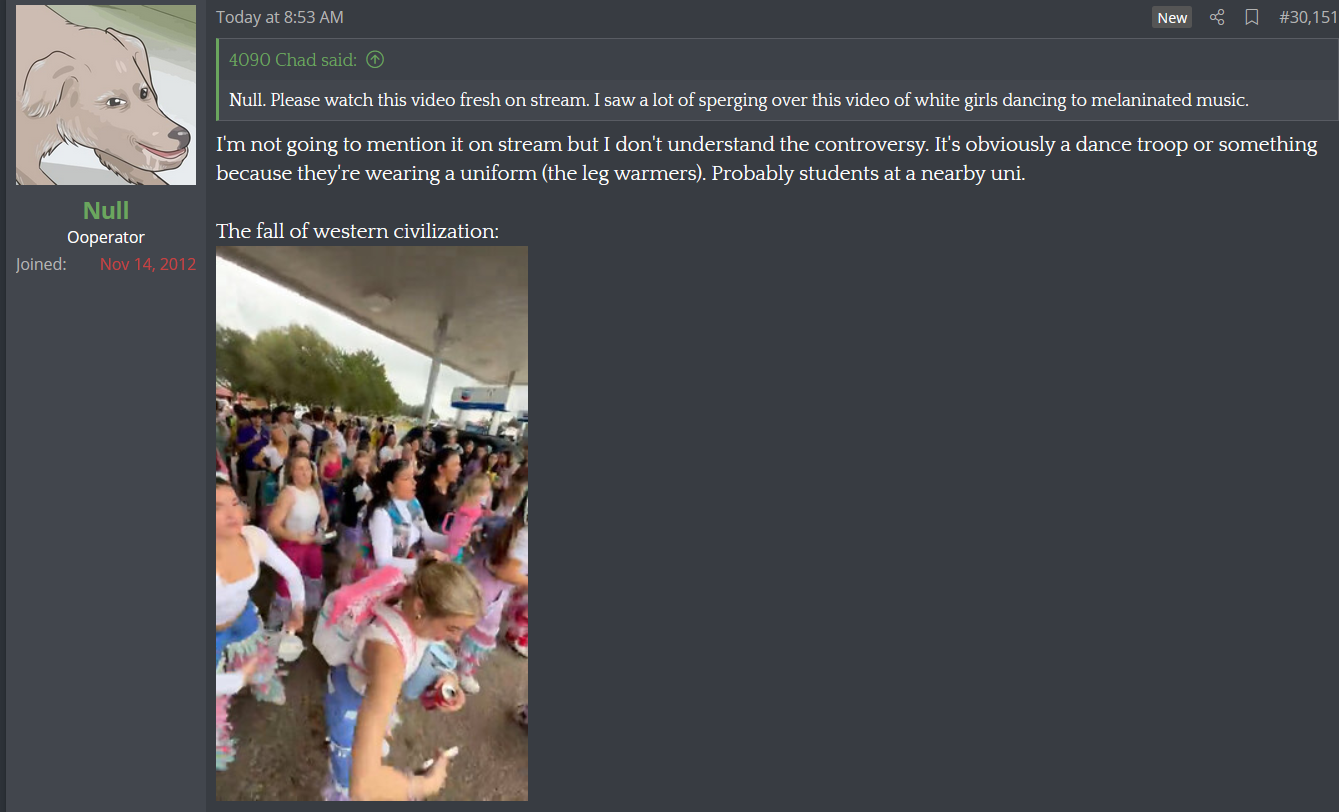 Null is a soulless coomer bugman tranny confirmed.Believe it or not Null not everything most men do is for the benefit or attention of women you fucking dolt. Anyone with half a mind for the most basic anthropology knows that dancing along with many other faggy things like collared shirts and high heels came from military fashion.