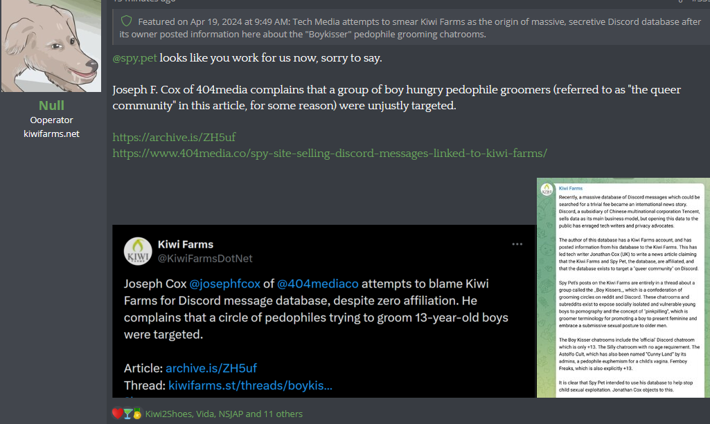 3. Owner of hacker site Raid Forum and confirmed pedophile Pompompurin had an account on Kiwifarms and used it to defend himself. You can find all the evidence of these claims in the thread below. He was also quietly banned sometime last year in 2023.