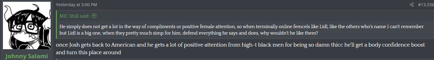 Josh enjoys being angry. It's an essential part of his /pol/tard grindset. He feeds on (and seeds) negativity.