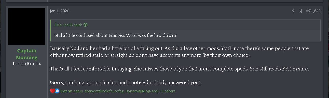 It seems Emspex asked for her account to be deleted sometime after quitting as her account shows as UA 674 now. Her quitting coincided with the first big hack in September 2019, but Captain Manning says her quitting has more to do with a "disagreement with Josh" than her being doxed in that great email list.