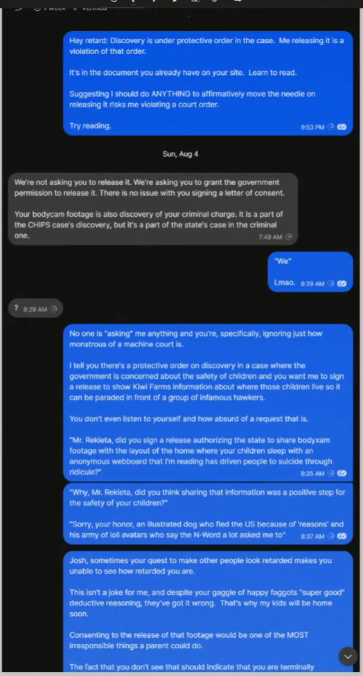 So his big plan is not using things Rekieta has said but that of his friends to try and trick the court to hurt Rekieta and his kids by releasing the footage? How insane is it that people on the tranny farms don't call him out for this shit.