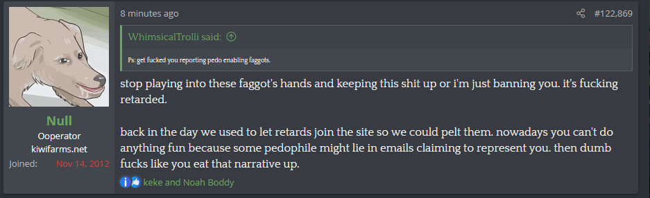 Right, Null is retarded. TBH, you really shouldn't care about being banned from a forum that is increasingly pandering to the most deranged. It was even too fucked up to an ex-furry like @Gargamel . I have no idea what Nullo is trying to make that forum into but it is not good.My first interaction with Null was in 2014 and already negative. I made a thread about a person I thought would be an interesting cow and he immediately locked it, then harassed me in PMs about how shit it was and that I just had a "personal vendetta" against the subject. I said he was wrong and that I didn't know why he was saying this to someone who wanted to use his site. He banned me so I stopped lurking there and didn't browse again until a few years later. I figured he'd grown up and mellowed out. I'd go to A&N to shitpost and kept getting banned from there. It was starting to become a circle jerk and I've always enjoyed ruining people's hugboxes. Then the man-hate thread happened and I thought that was cool because it was pissing off the poltards so I did appreciate Null for letting us have that. I had started to become disillusioned after I saw the screencap above where he was threatening to ban people for posting in featured threads. Then I saw the retarded virtue jerking in the kris tyson thread and couldn't help myself. I got banned and then called him out on being a hypocrite when I came back. At that point, I just decided to say whatever I wanted without caring about getting banned again. So I did.
