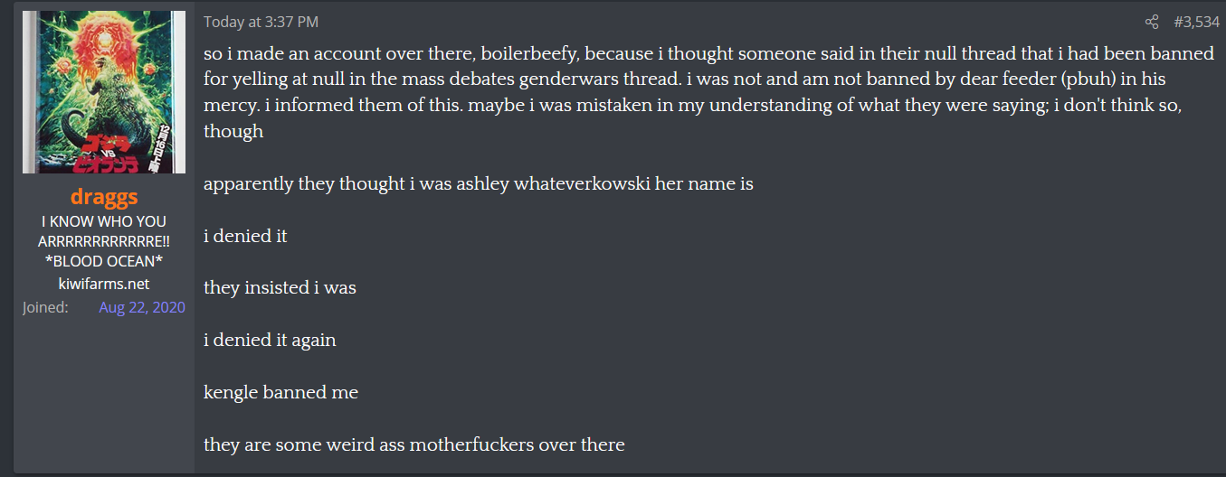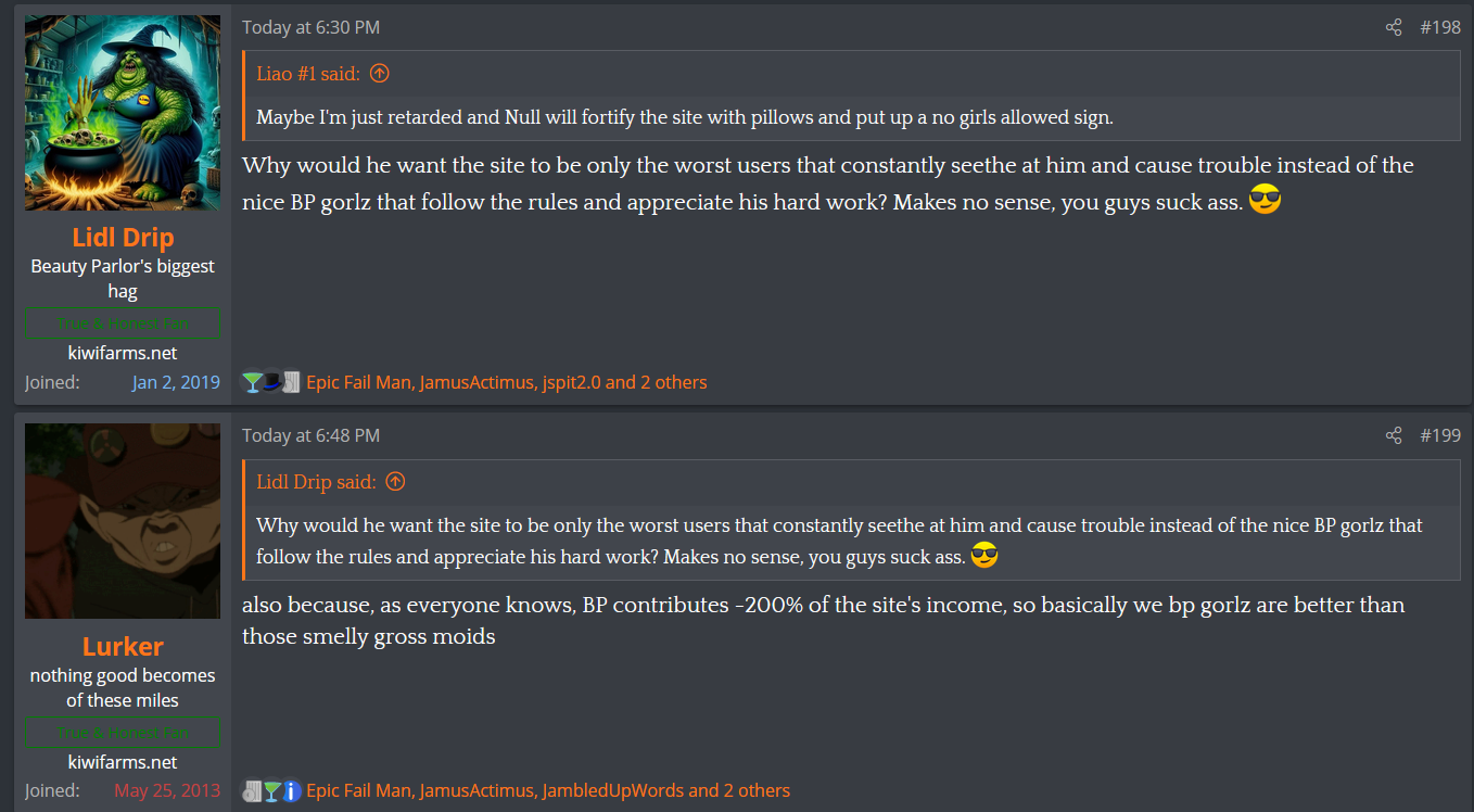 "Why would he want the site to be only the worst users that constantly seethe at him and cause trouble instead of the nice BP gorlz that follow the rules and appreciate his hard work? Makes no sense, you guys suck ass.