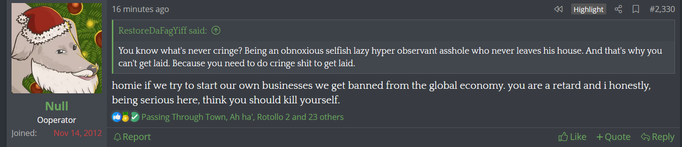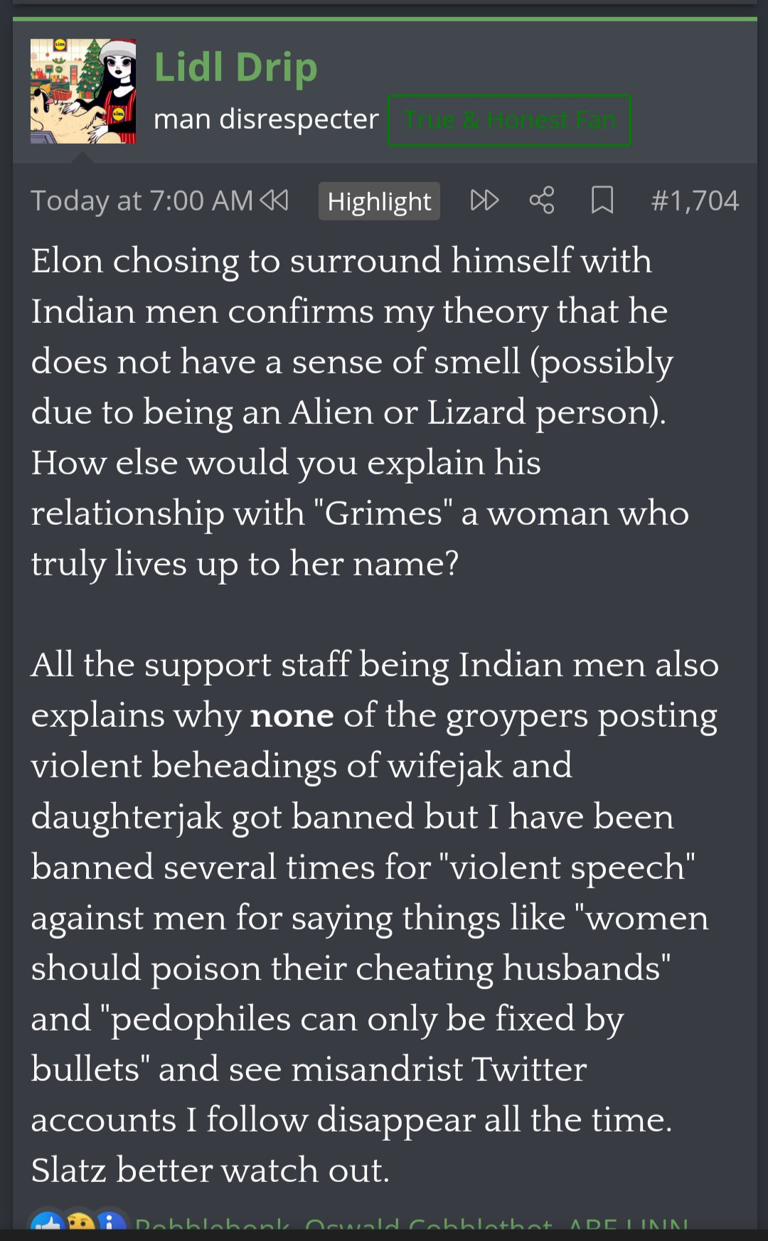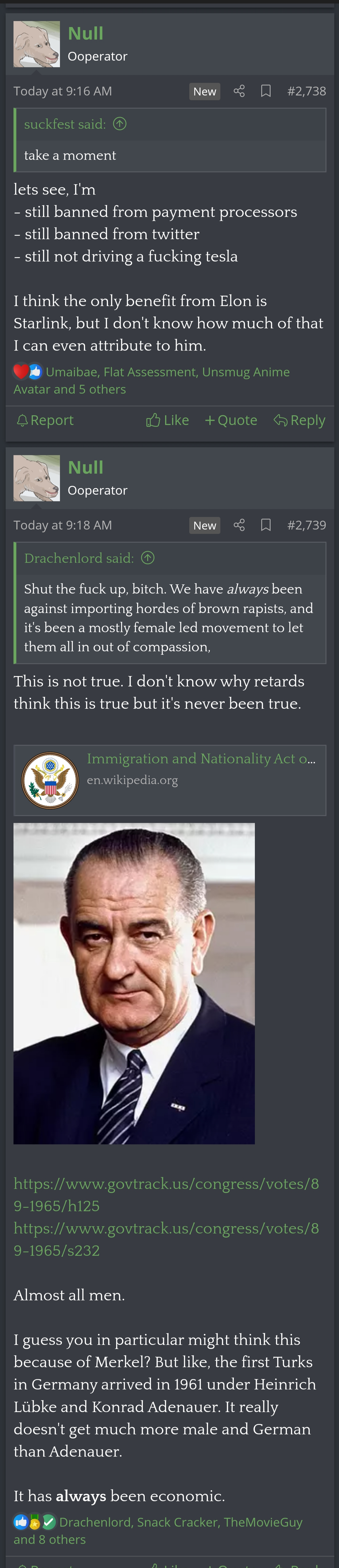 Null's not even being subtle about his socking now, between "her" seething about being banned about Elon, seething about Indians, and random off-topic seething about groypers. Even CWC's "JenkinsJinkies" account was less obvious than this.