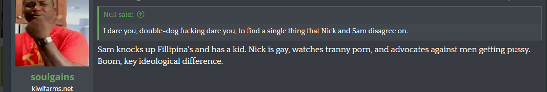 Hygiene, I get the imprison that nick is super anal about two things; cleanliness and the colour of the willy he's about to put up his arse. I get major prissy princess vibes from furentes, no wonder he's a catboy. Null is also prissy, but not the kind that insprise cleanliensss or self improvement/come to think of it, what does josh even disagree with nick fuentes about?