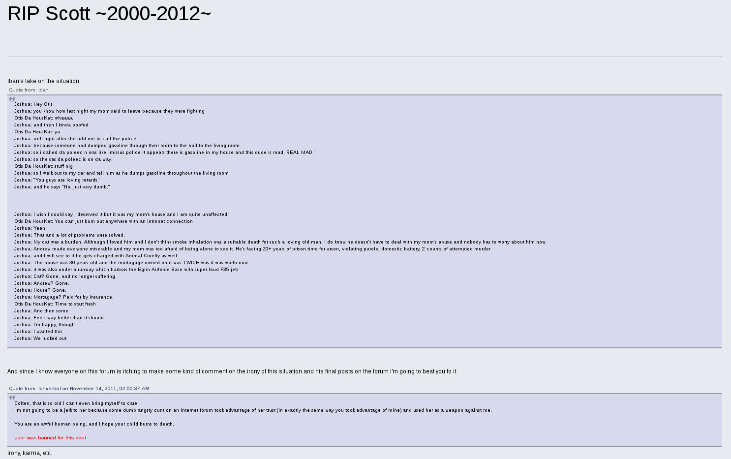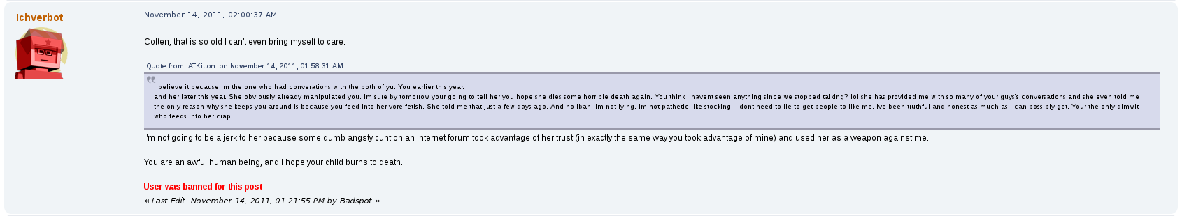 One of his accounts, Ichverbot, only existed for a total of three days before being permanently banned by BadSpot for Josh voicing his wishes for another user's children to burn to death.