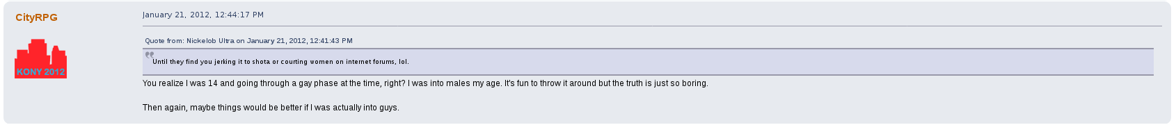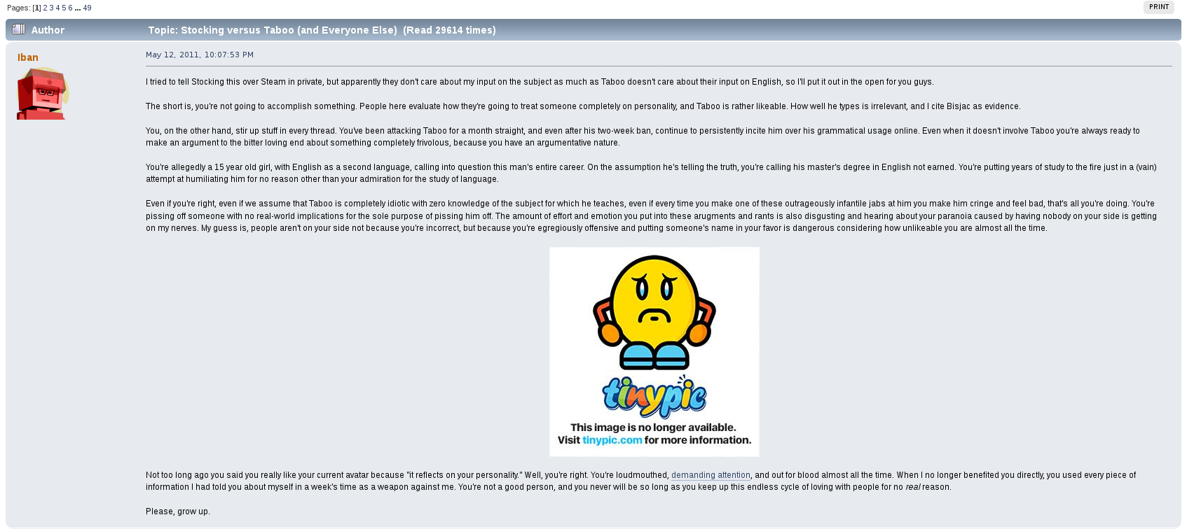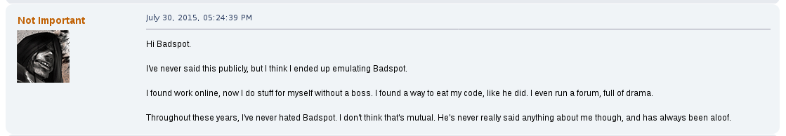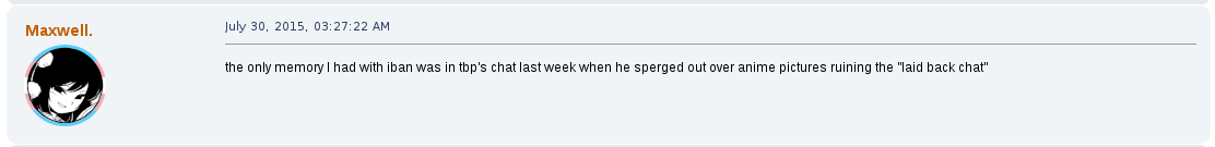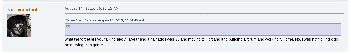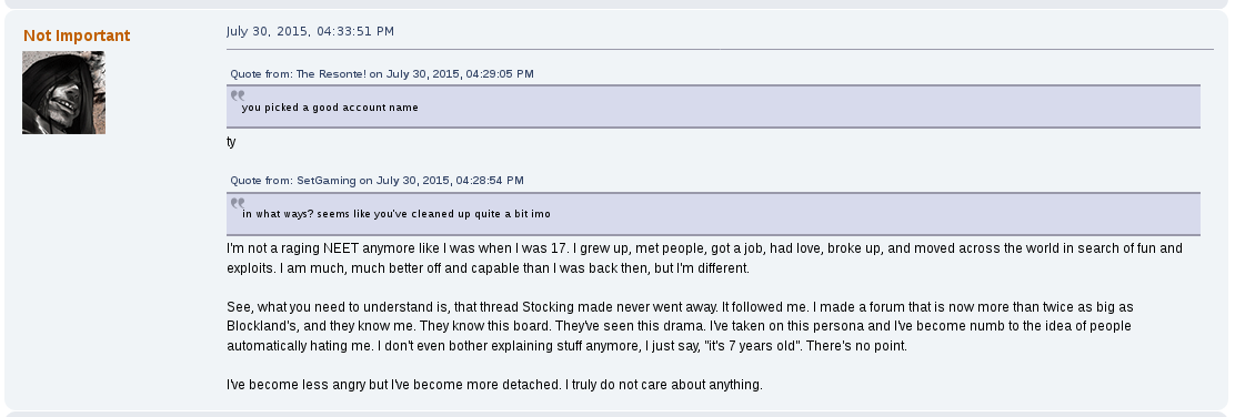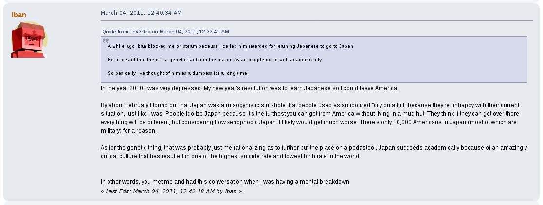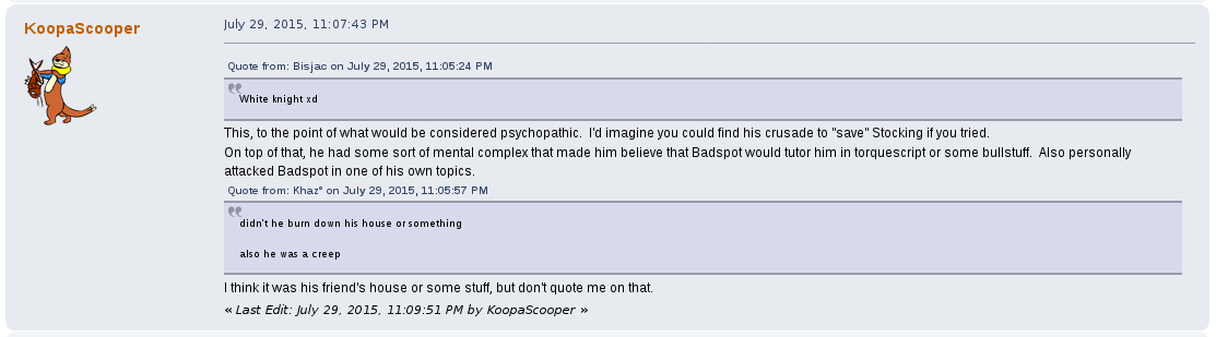 Away from the game he would commonly argue with other users on the forum, becoming a de facto antagonist of it, one spoken of as their own proto-lolcow. One of his most creepy moments was the archival of other users personal information that he would store for future doxing and blackmailing opportunities. One such thread, "Post your face pictures", was one he downloaded files from and posted himself in.