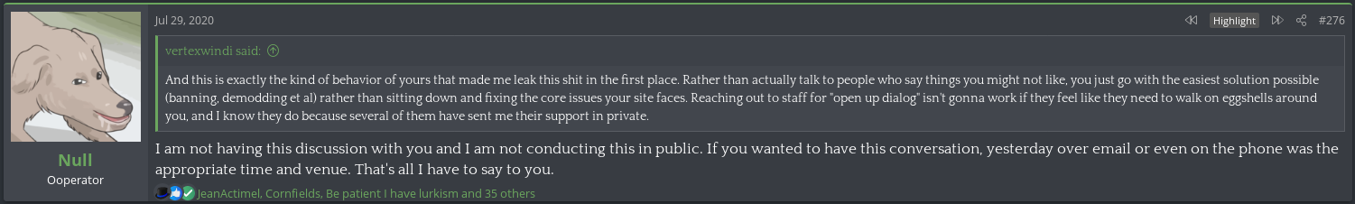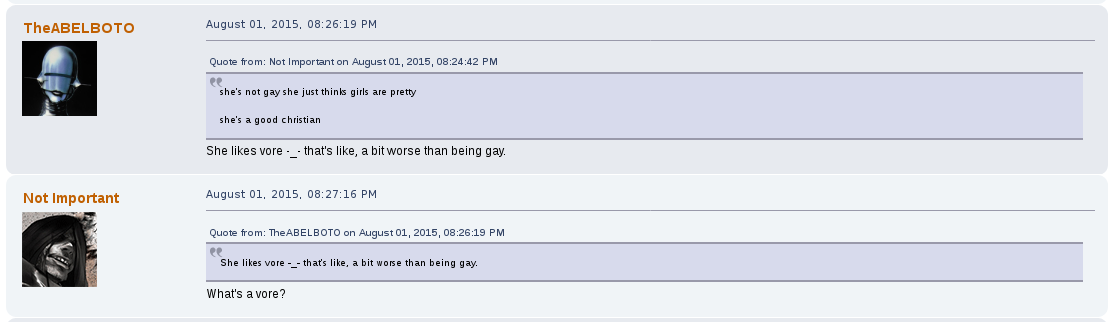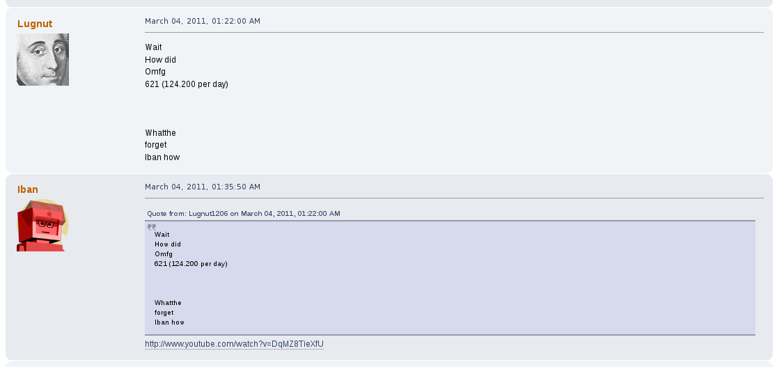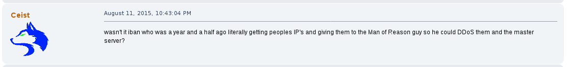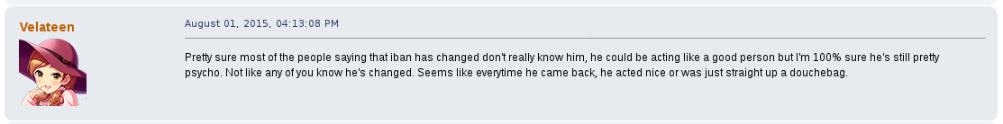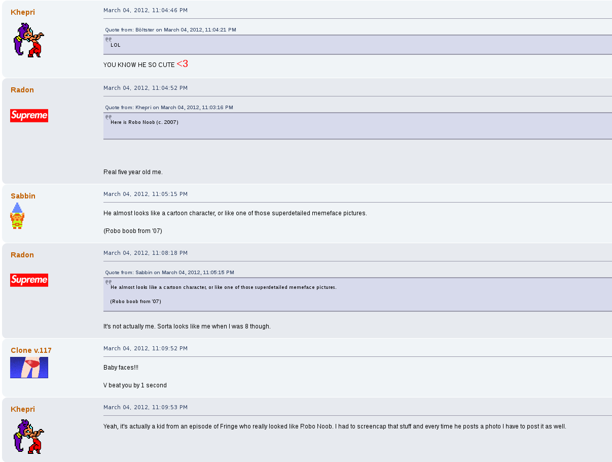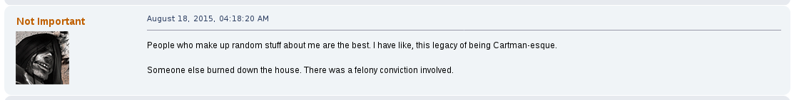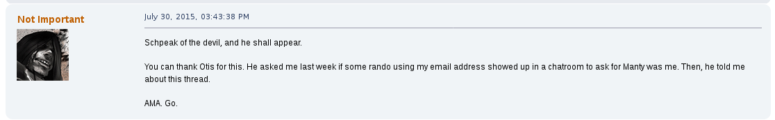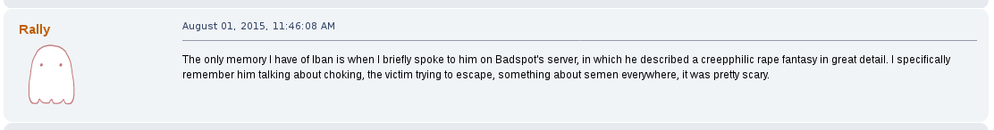 Away from the game he would commonly argue with other users on the forum, becoming a de facto antagonist of it, one spoken of as their own proto-lolcow. One of his most creepy moments was the archival of other users personal information that he would store for future doxing and blackmailing opportunities. One such thread, "Post your face pictures", was one he downloaded files from and posted himself in.
