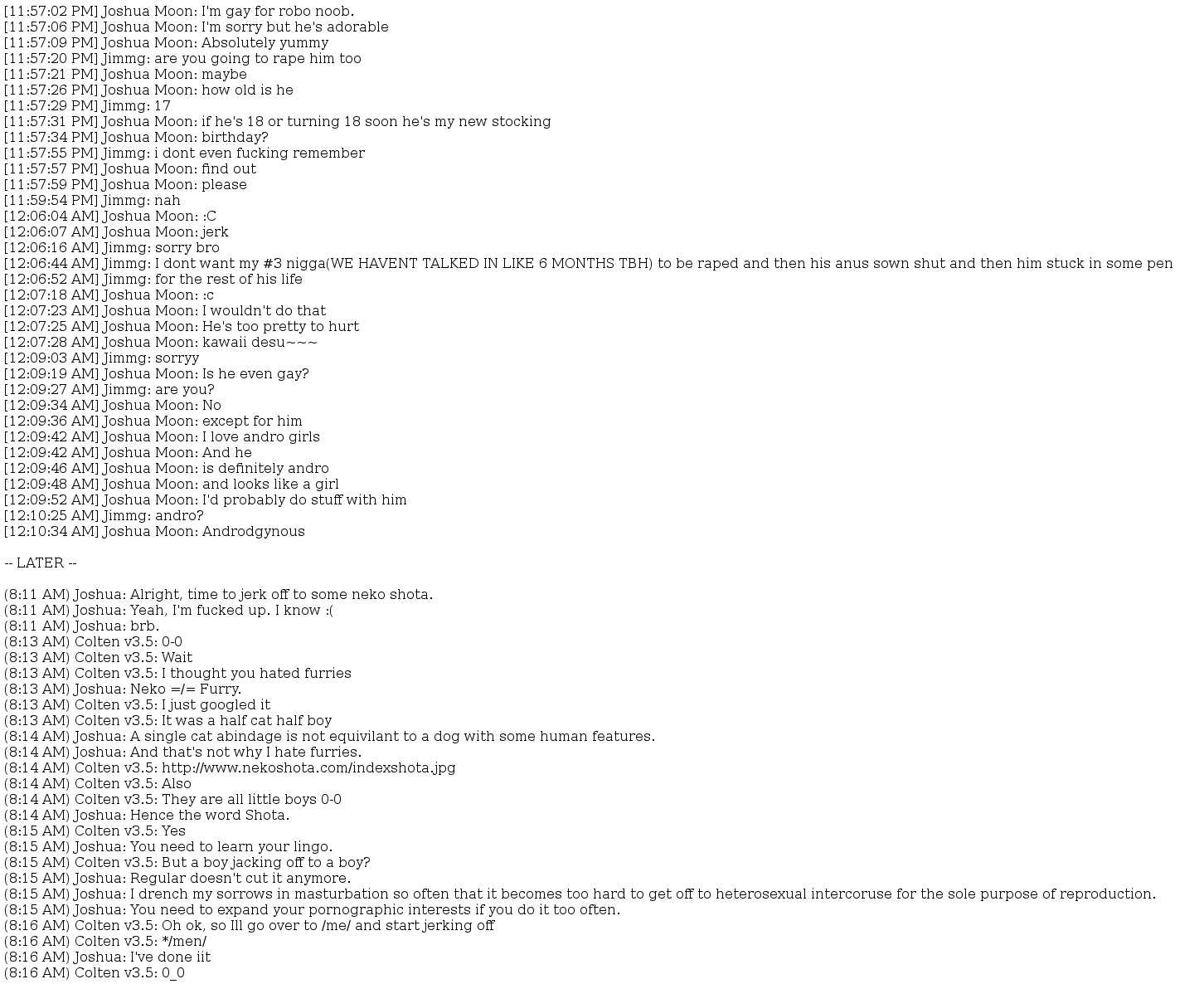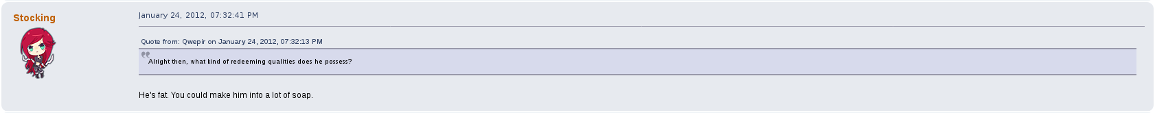Aside from the cat boys he's also voiced love for other (Male) forum users, even going so far as to say they'd be "The new stocking". A PM to the user Jimmig regarding a picture uploaded of Robo Noob: