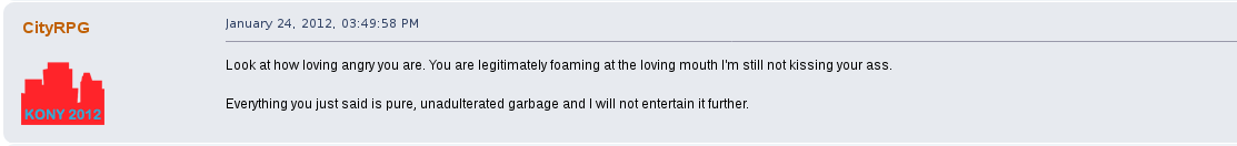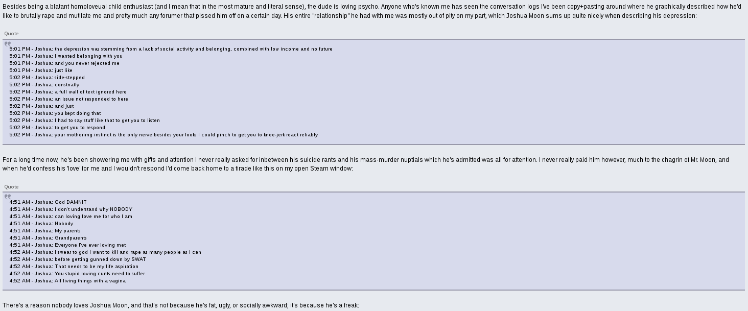 "You're a pathetic, dangerous man-child, angry at the world for your own pathetic failures. This is but one of your brief moments where you act like you're conked out on drugs or something and you start pretentiously playing the victim card and offering bullshit explanations to foster a pity-defense. Yes, you are extremely pitiable. You're poor. You're ugly. You're fat. You've never had a normal relationship in your life. Your grandparents are disgusted with you. You flunked high school. Hell, despite all your contributions, you're too much of a freak to properly fit in an internet community full of teenagers."