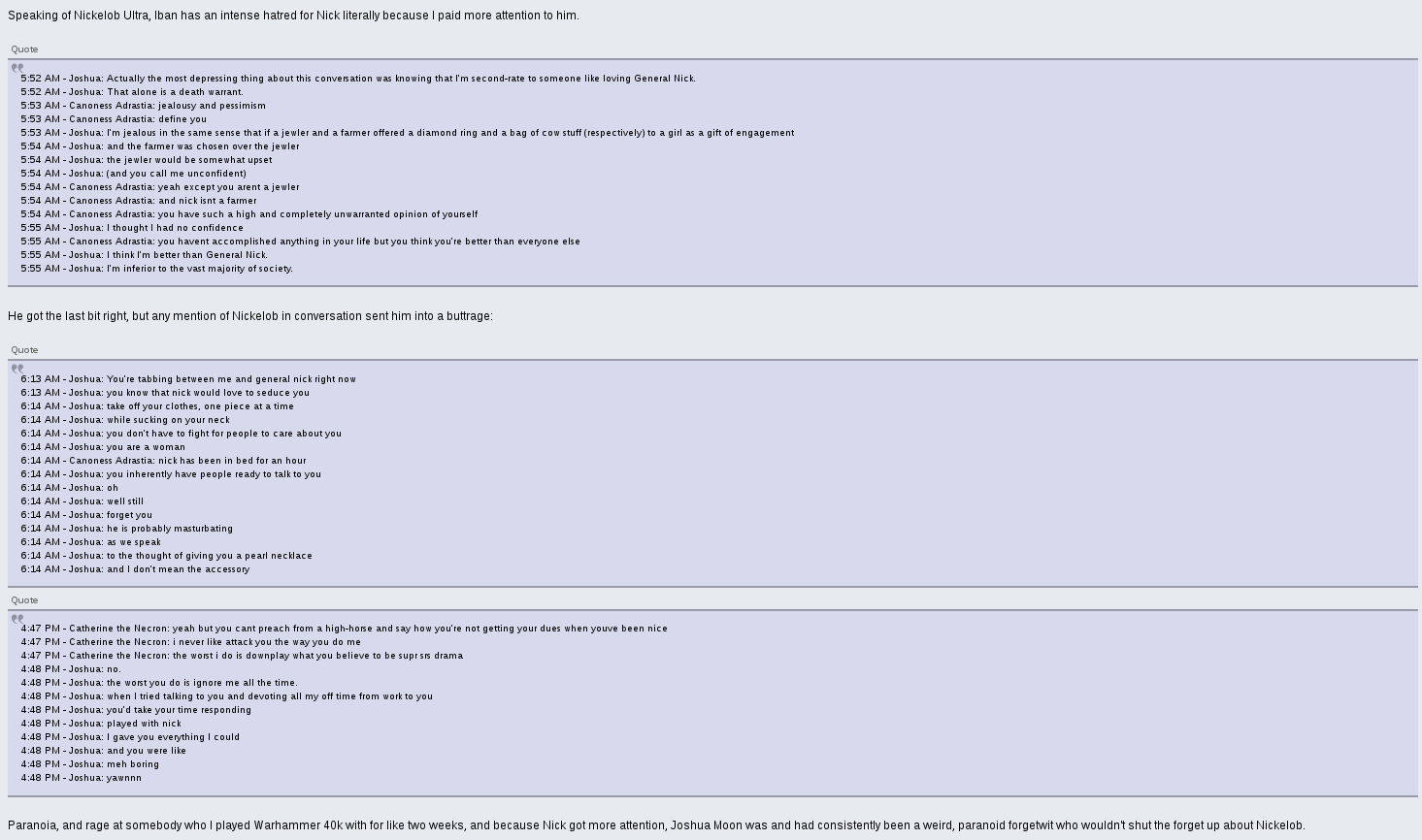 It is immediately apparent he was a nuisance based on the amount of alt accounts he had created over time alone. Going by the names of IbanZ, IbanX, Iban, Ichverbot, CityRPG, and Not Important (Each of which he paid a crisp $20 for), he was notorious for being an insufferable prick to everyone and anyone he interacted with, constantly complaining about... something, and having strange, disturbing, and outright bizarre antics. The developer and administrator of the game BadSpot himself had referred to Josh as an "Established Retard" and the most anti-fun person he had ever witnessed.