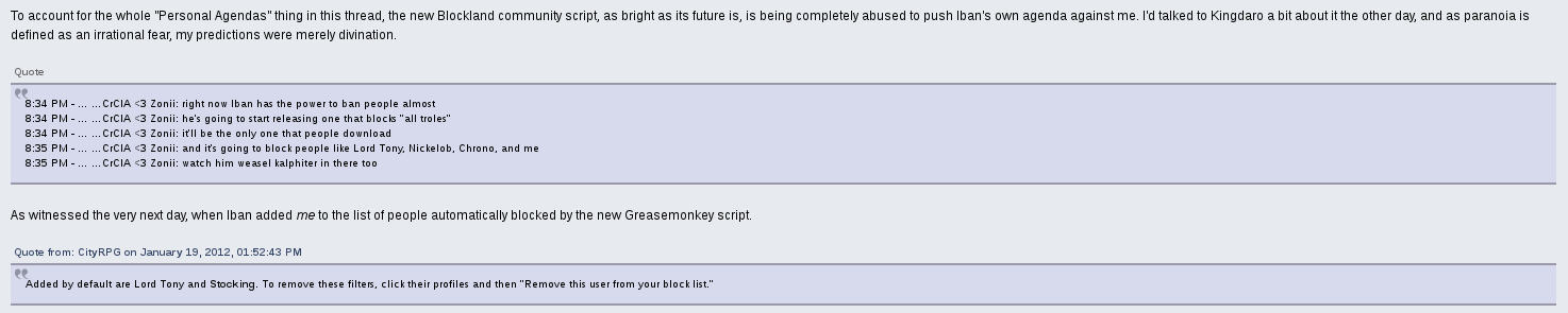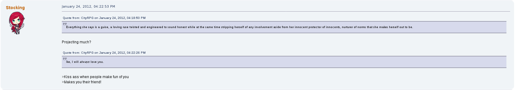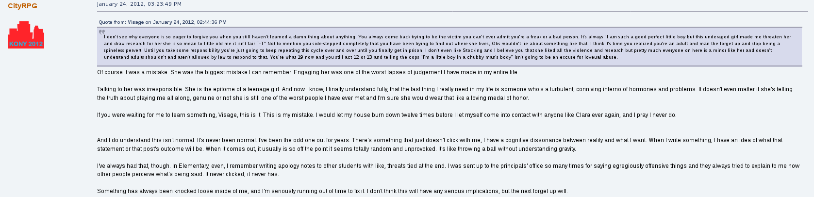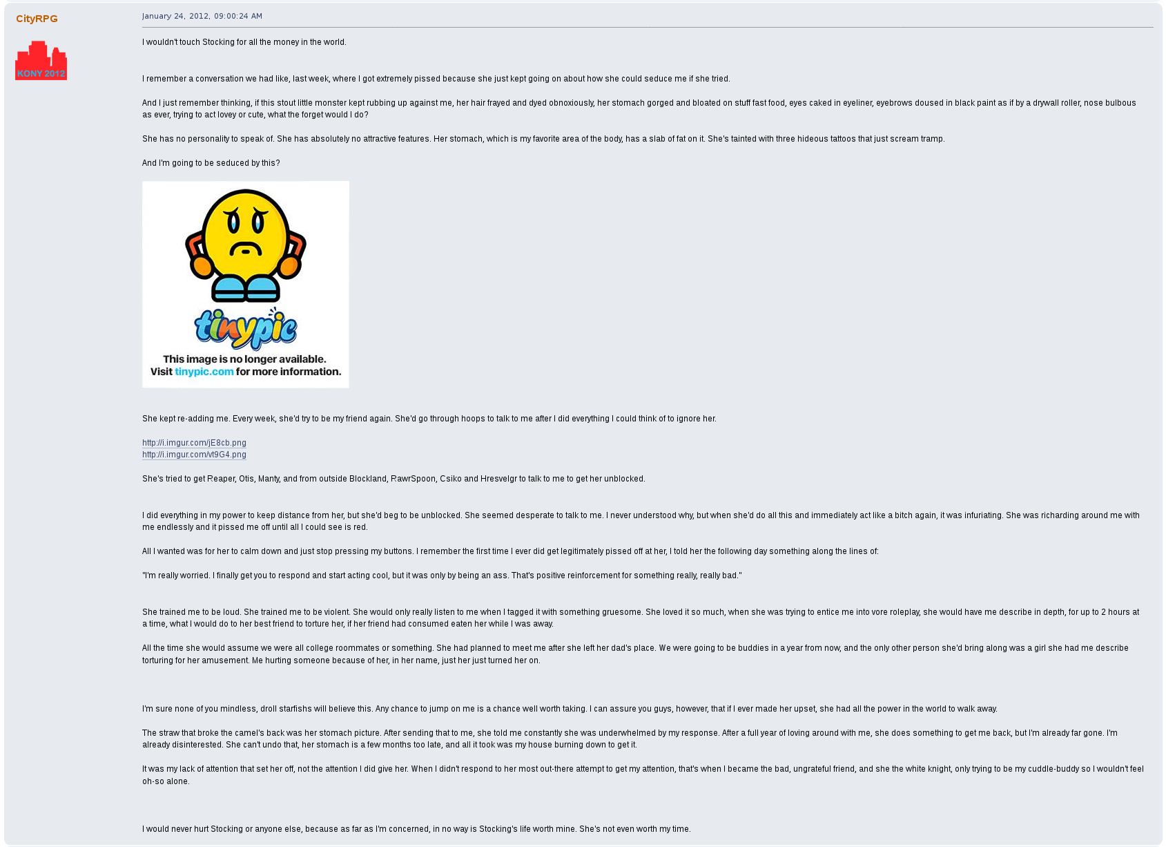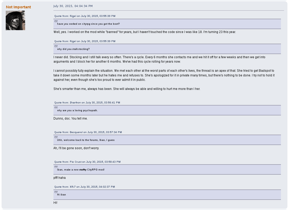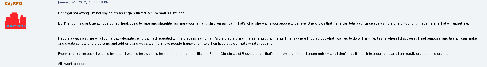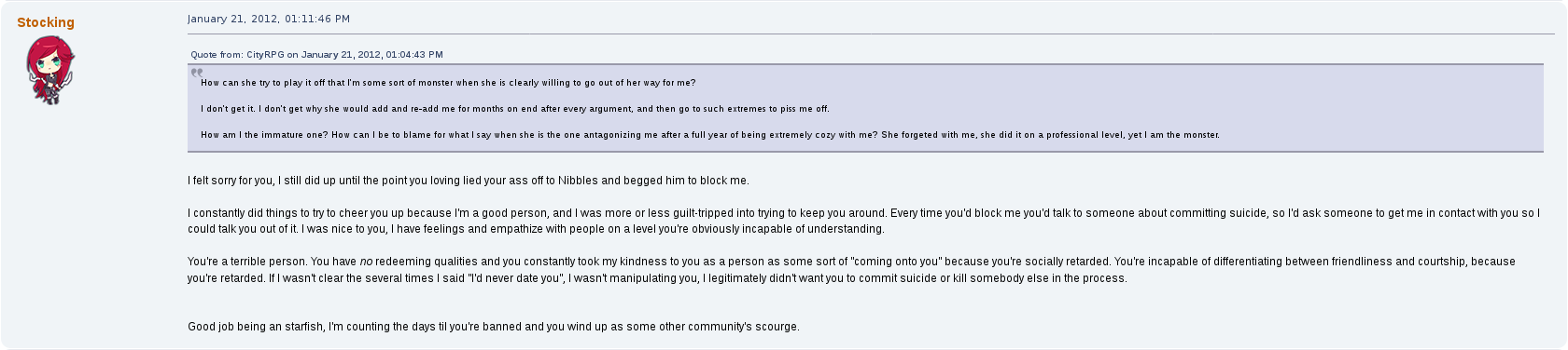 When he wasn't being consumed physically and mentally by Stocking, he was viciously against her, posting threads in public about his qualms with her and even going so far as to program his mod, CityRPG, to make her messages and presence on Blockland servers invisible, silently. A shadowban that no other users could opt out of. At one point he threatened to rape, chop her body up into pieces, and leave her to starve to death alone. His excuse? "I was really angry that day".