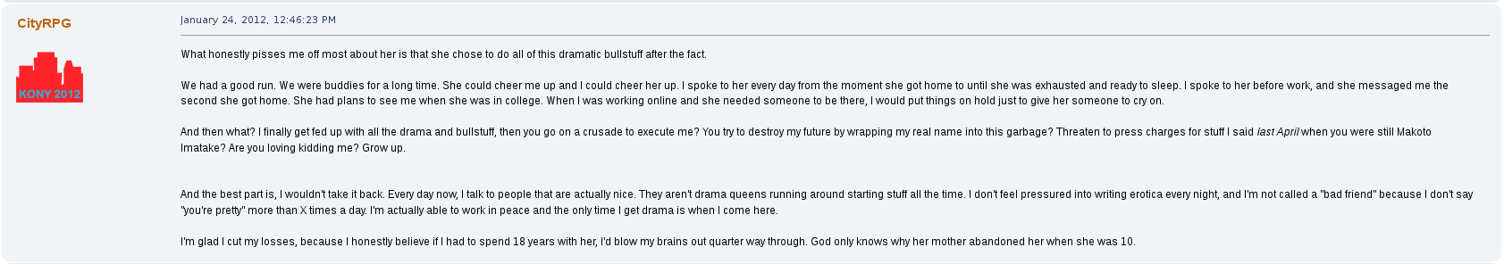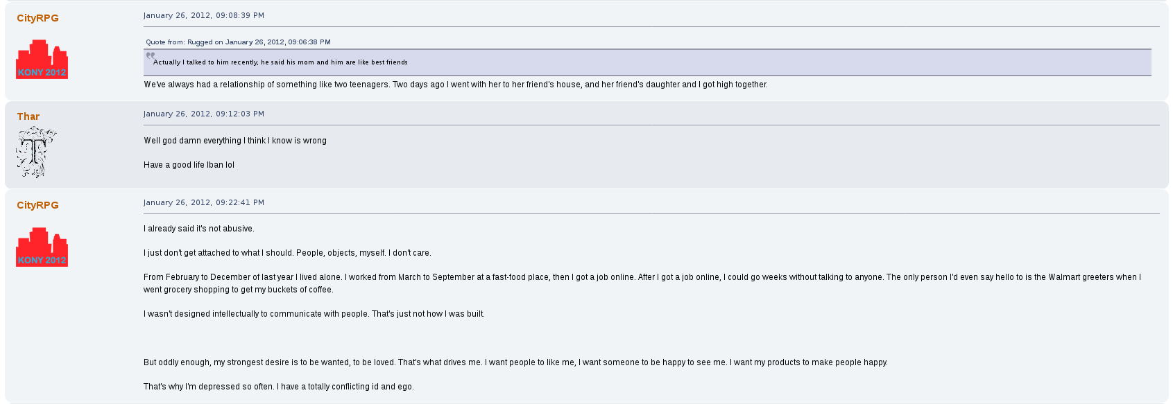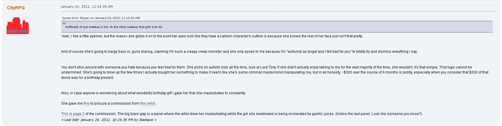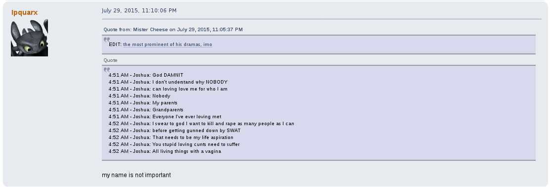 read the last paragraph of the OP autistGreat stuff but why didn't you feature his whining about mommy issues? The posts where he talks about wanting to kill his mom for not loving him enough
