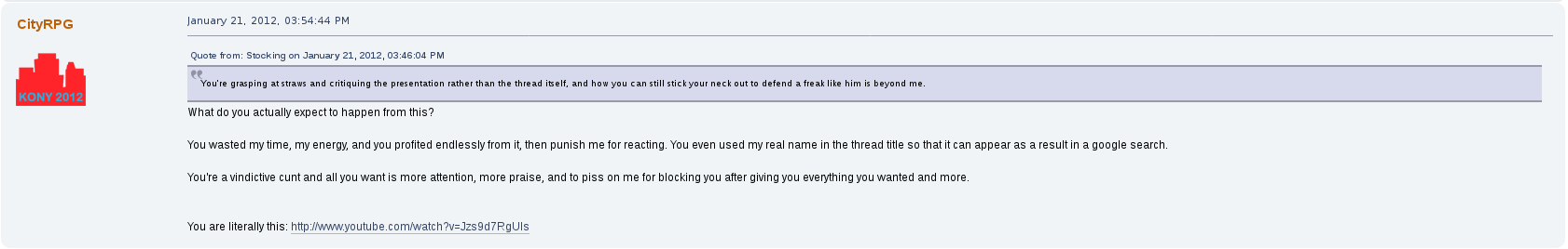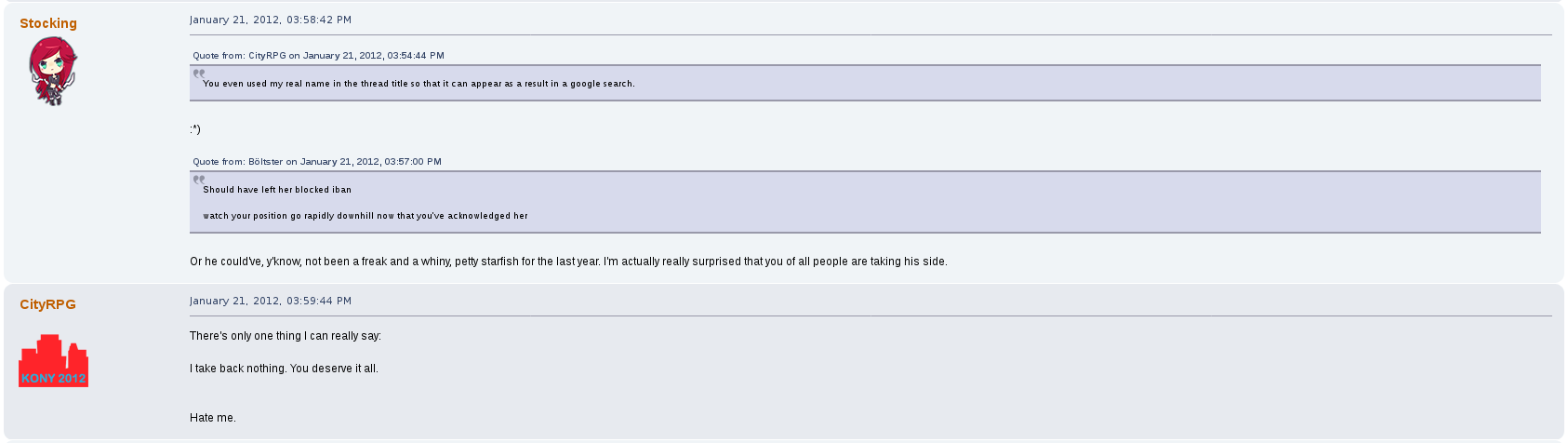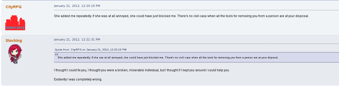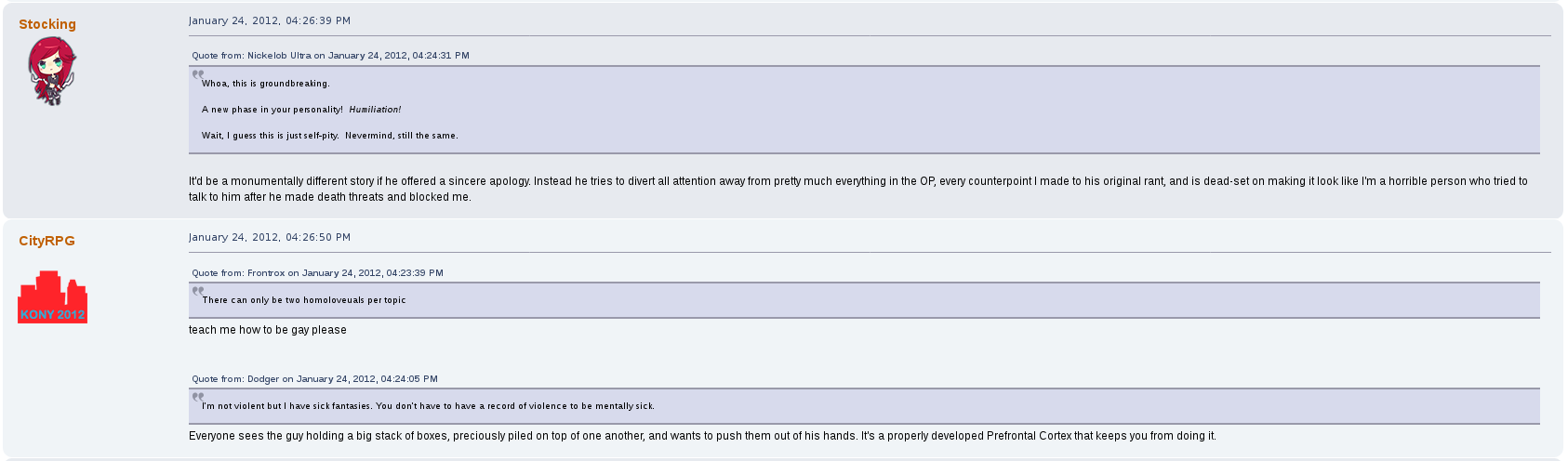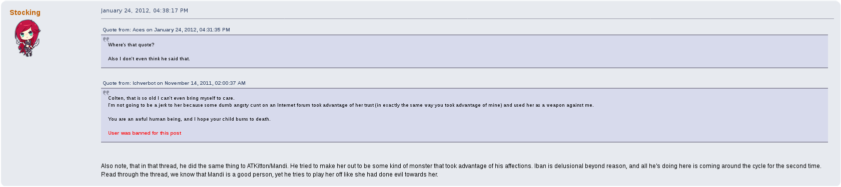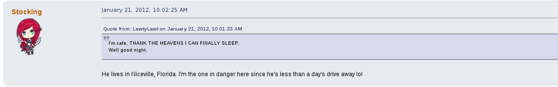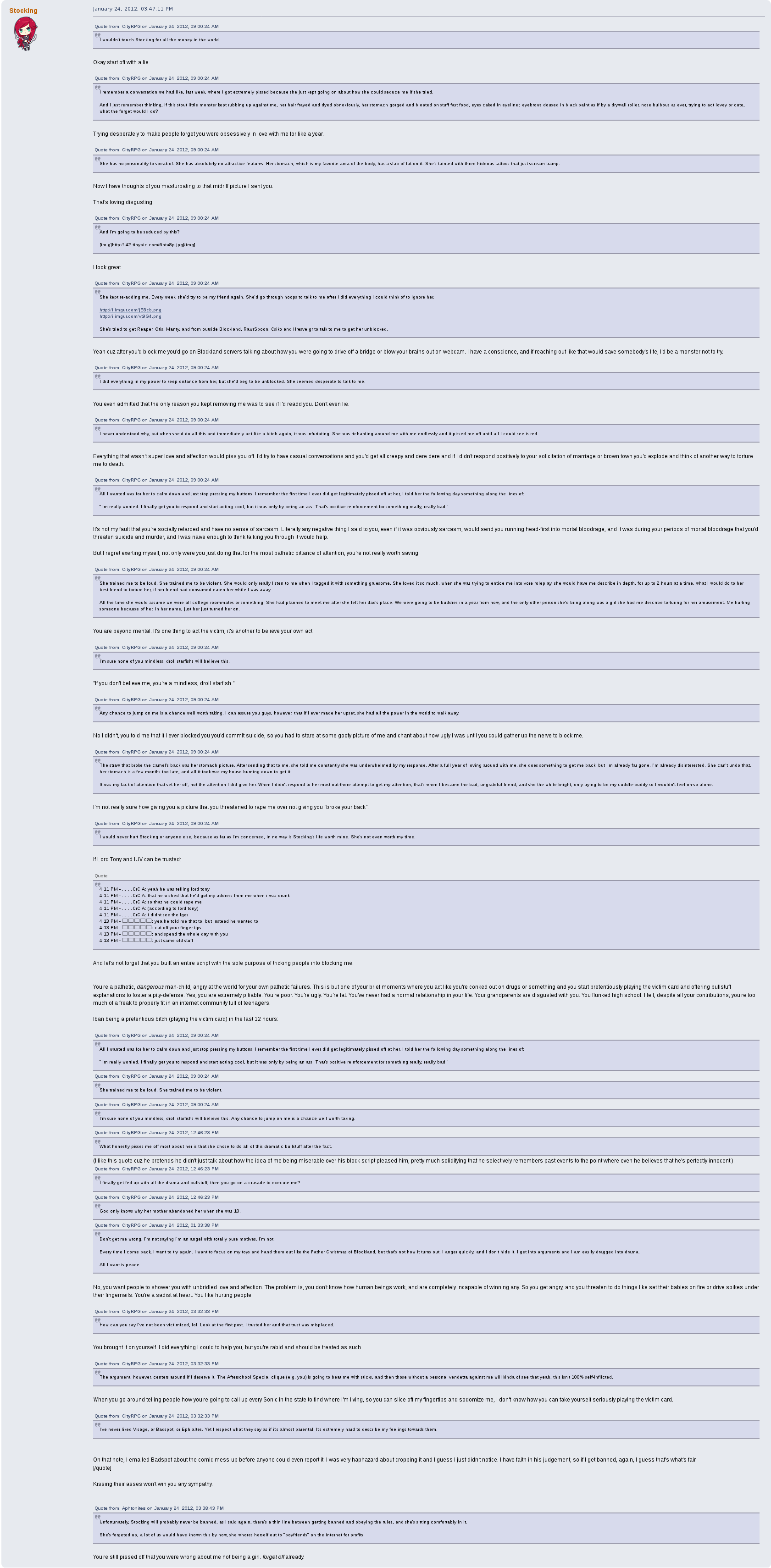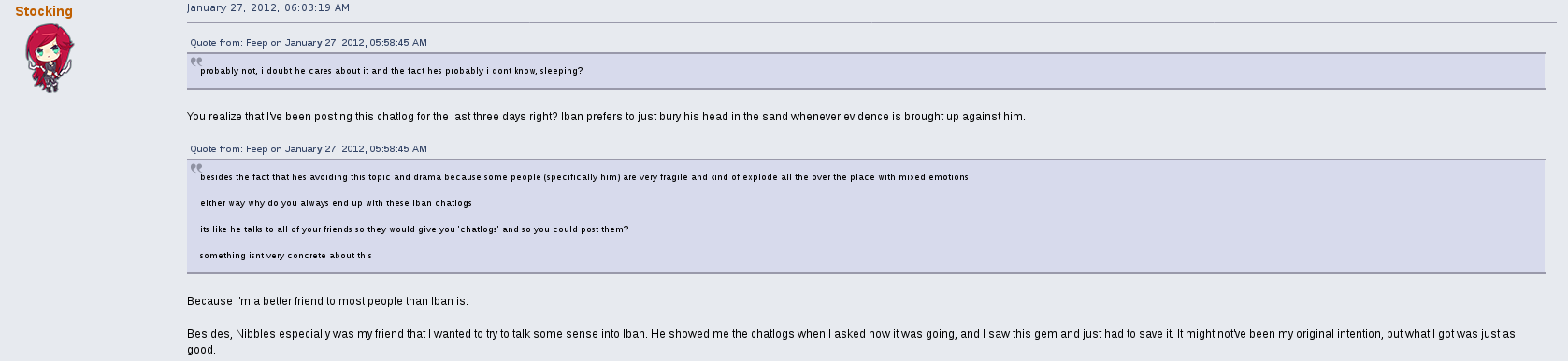 But perhaps his most prolific drama on the forum was with a female user by the name of stocking.