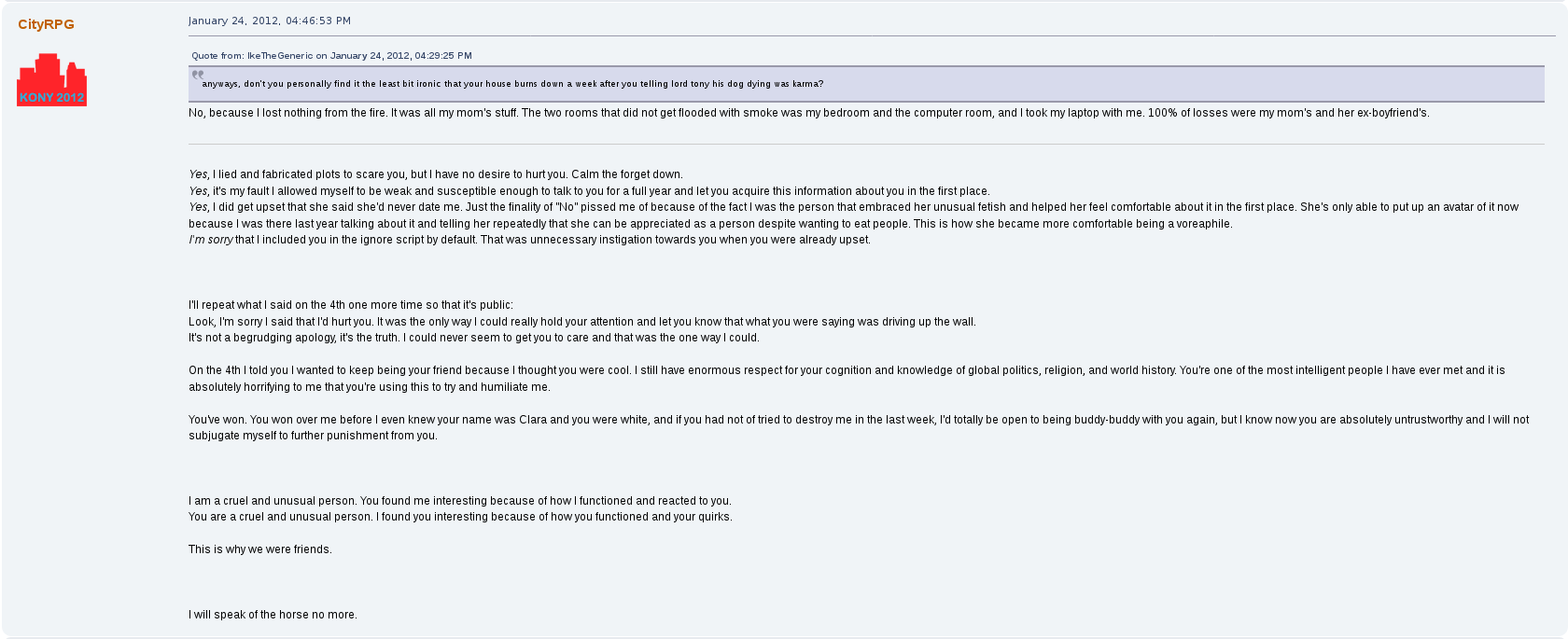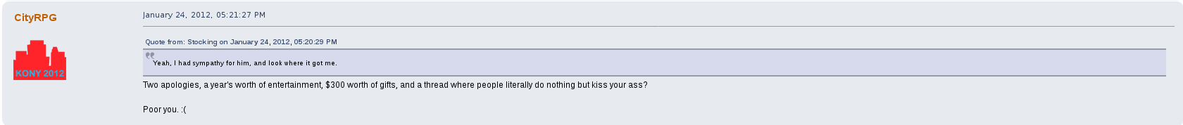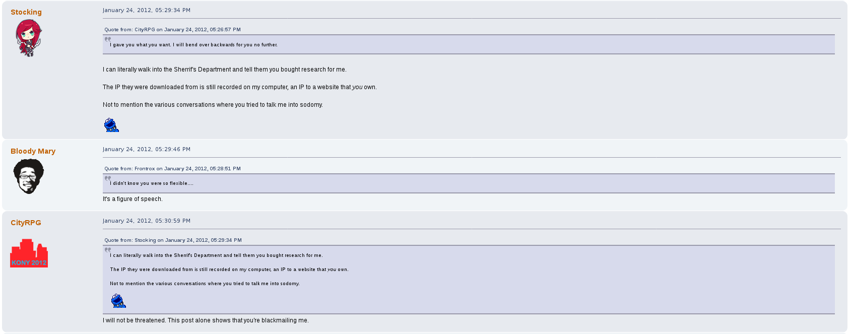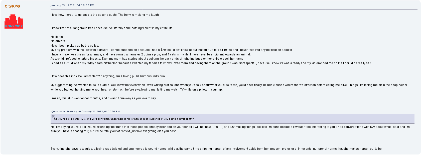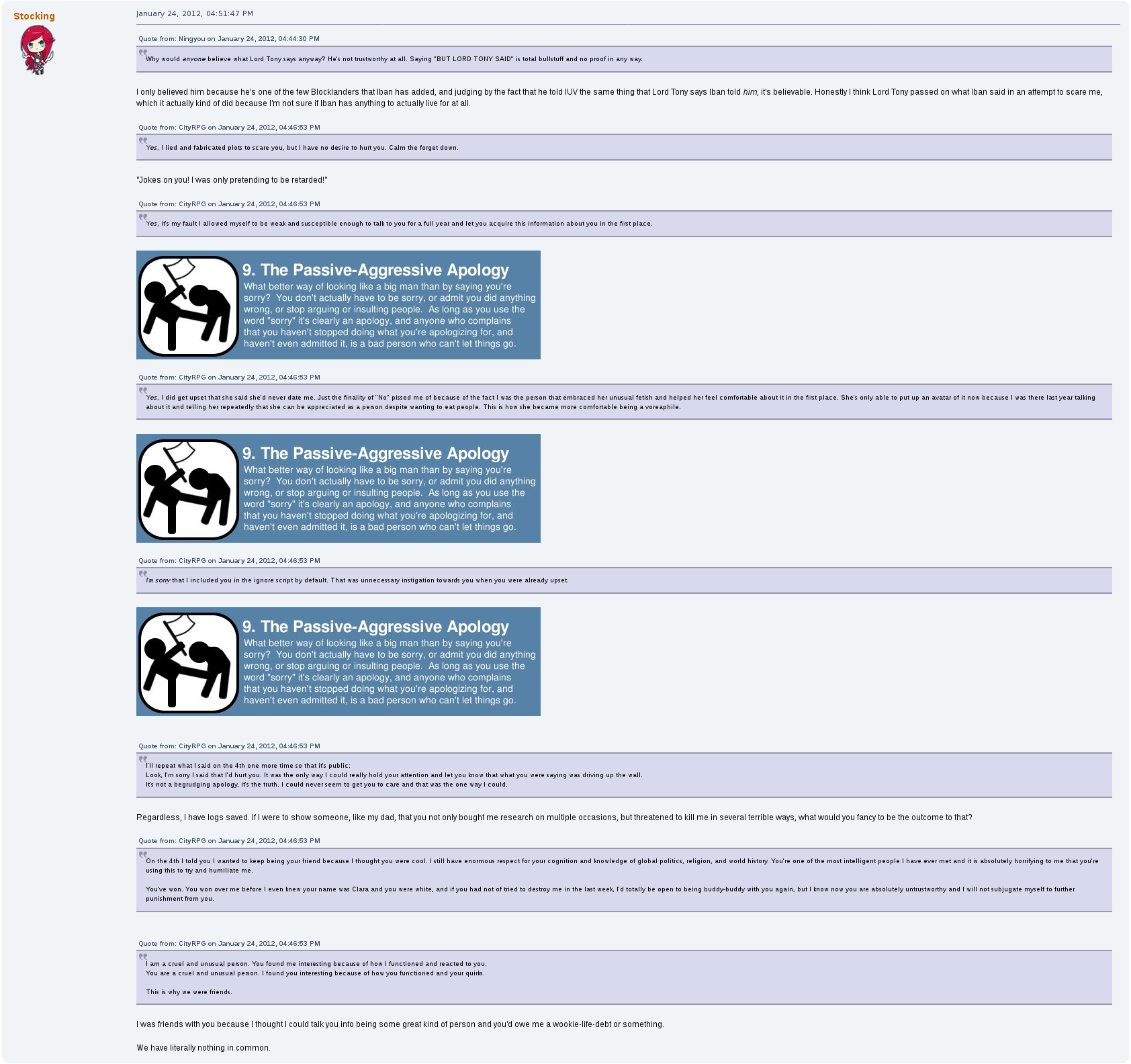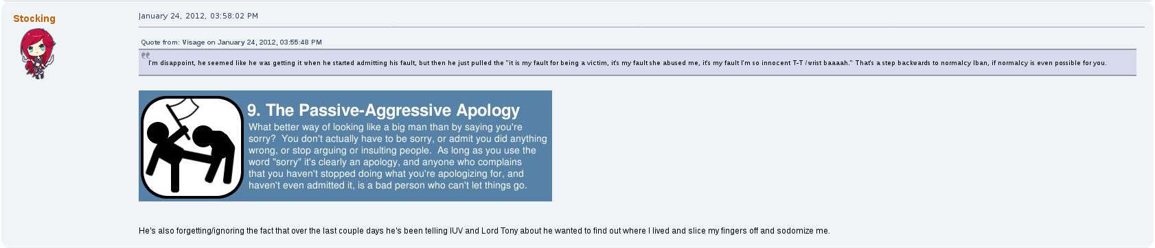 But perhaps his most prolific drama on the forum was with a female user by the name of stocking.