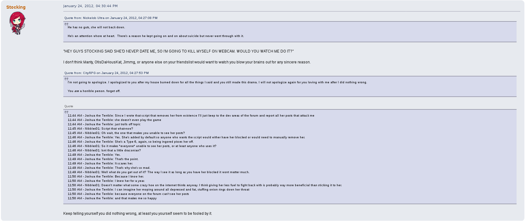 Now, let's set something straight here. Both Josh and Stocking are massive attention whores and caused much drama within the community, but Stocking felt pity for a suicidal and pathetic Josh and continued to communicate with him, even after all of the ways he had threatened, insulted, and publicly humiliated her. She attempted to wrangle the tard, and the tard was having NONE of it. Josh made multiple posts and threads about his interactions with Stocking which no one had asked for, and of course making her out to be the villain of the situation. Whether Josh is the reason the Blockland forums has a drama board is a mystery, but he certainly breathed life into it.