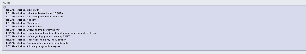 Female users in particular were disturbed by his presence. Known to live in Florida, users would joke about Josh personally visiting users at their houses and raping/kidnapping them. Other users from Florida had voiced their concerns living within 100 miles of Josh.
