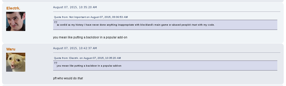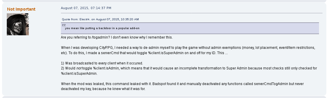 His CityRPG mod contained backdoors that he could use to become a "super administrator" on any server he wanted via the simple command of /togadmin and an internal Name check.