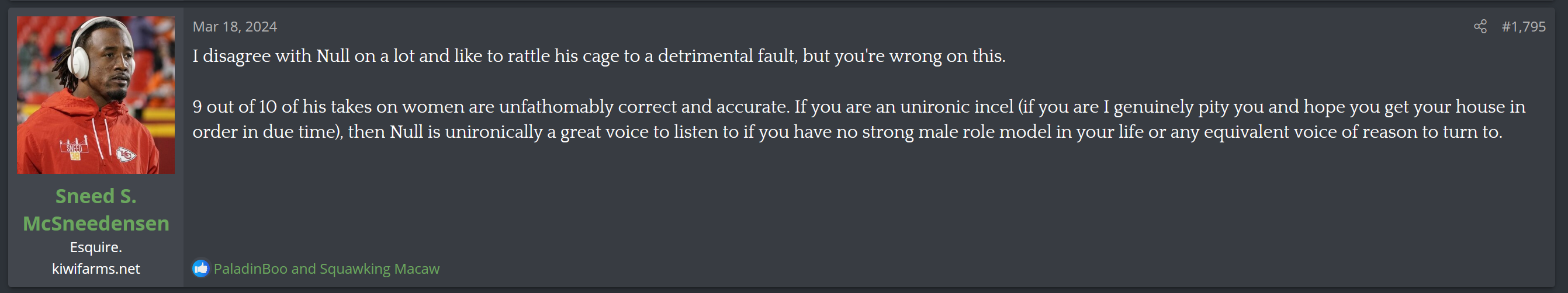 Im trying to think if there is anyone worse but even if you are a fullblown incel you are better of taking the advice of almost any redpill grifter then Null. Their advice is gonna boil down to: Don't date 304s, chase success and go to the gym.