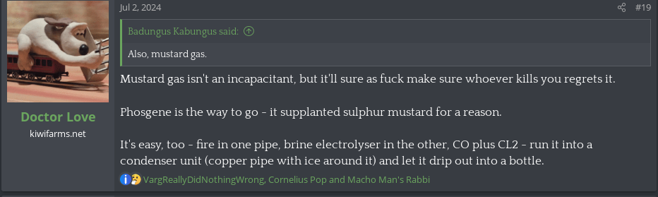 "Troons are the enemy of KiwiFarms... unless you call one of our female members a troon, then YOU'RE the enemy" - KF Jannies, probably.The gooning is spilling out into the streets since the DM groups got nuked. BP makes a thread about their "video game husbands". User Neo-Nazi RIch Evans is banned immediately for saying it smells like a troon thread.