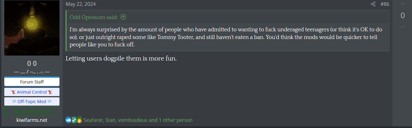 I've noticed that people have taken an interest in how Kiwi Farms is turning into a cesspool of infighting, furry degeneracy, cliquish mob mentality, and general depravity. It's hard to have any kind of conversation there without worrying about constantly being harassed by people who disagree with your opinion. It's turning into a high school lunchroom, but with people I wouldn't let near a playground, let alone a keyboard. Such is life, I suppose. Also hello to all its nice to meet you.Collection of farmers posting fucked up shit as posted by user kosmikulduzbok. Some of this has been posted already but some is new.