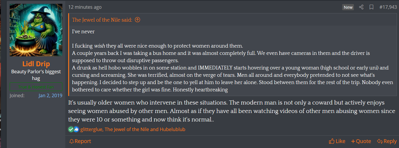 Like niggers? Niggers do that, you point out that their Cultural Marxist bullshit take, is just that, they get all uppity uppity. Same as feminists.KF men have been conditioned to think they can harass and shout down any information or criticism that displeases them so they don't know what to do with her.