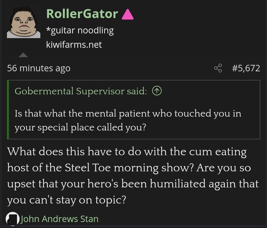Not only that, but Gobernmental Supervisor (Aaron Imholte simp) also strangely tries to say RollerGator was violated by a "mental patient." These are sick people the same way Kiwifarms users mocked streamer Steven "Destiny" Bonnell for allegedly getting molested.