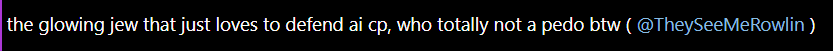 yeah because you think ai child porn should be legal, and you unbanned people who say shit like "child porn isn't immoral as long you don't pay for it". You were defending ytsuken for posting that child porn wikipedia link too.