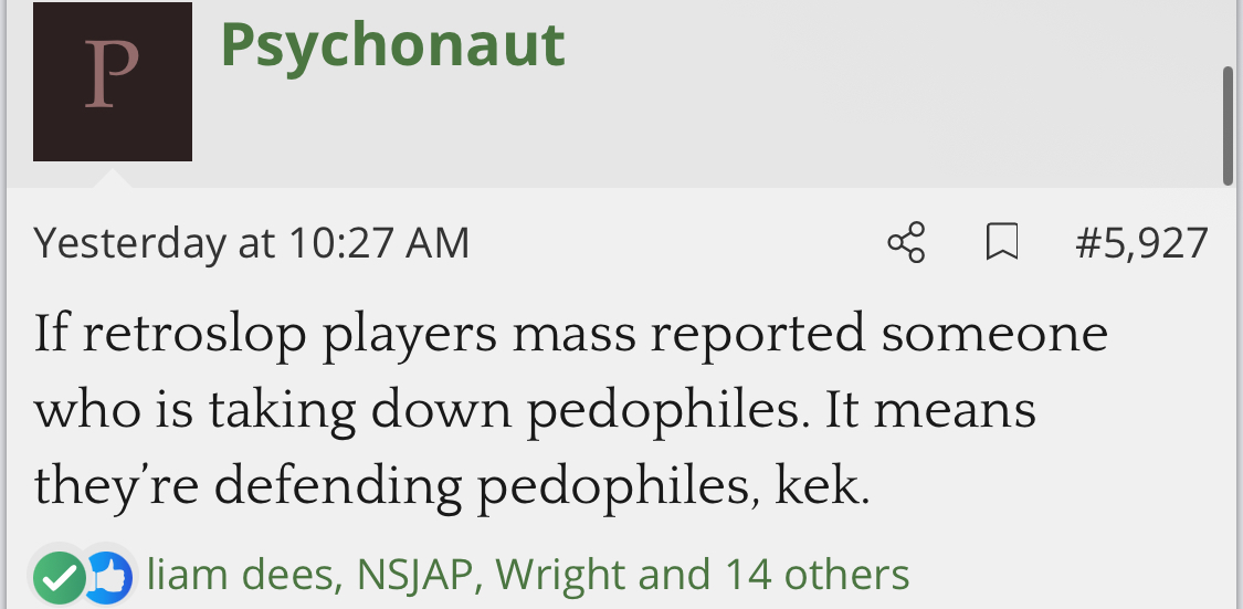 Hunting pedos is fine and based but getting retarded Roblox kids to use Josh's grooming doxing and harassment forum isn't. As long as they're not making it so the chomos get away by mishandling the situation forcing cops to side with them while letting them learn from their mistakes. They should at least be effective, I don't care if it's about clout chasing so much as they accomplish something. It is also fine to point out they don't actually care about the kids as much as they care about getting paid. If they owned up to it I'd appreciate the honesty but it would probably drive away other people why do care about that thing.It’s been too long not complaining about Ruben