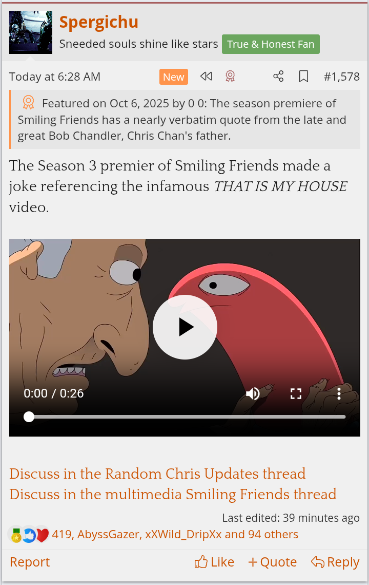 Smiling Friends is the living embodiment of Poe's Law because most of the time you're not sure if the writers are joking or being 100% serious. Maybe this is a reference to that now infamous Chris Chan clip or this could be 100% coincidental. For all I know, the forest demon from the Halloween episode could be a reference to some really obscure meme that most people aren't aware about (like say probably inspired from a now long forgotten YTMND video or whatever) and the character was never an original idea to begin with. It's for this reason why I question if this is really a reference to that now infamous CWC video clip or if this is just the writers wanting to fuck around with the show's absurdist humor and this was just purely coincidental.