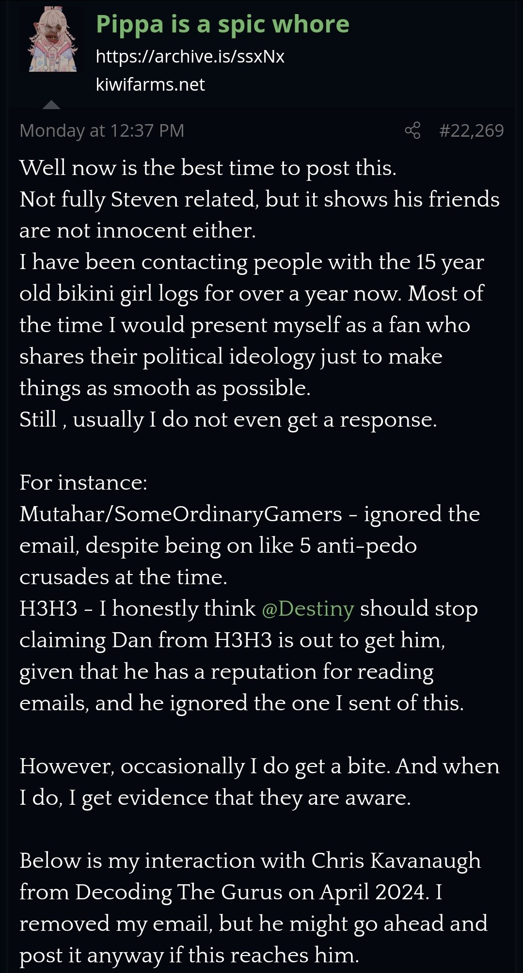 Kiwifarms user Pippa Is A Spic Whore has admitted that he has been contacting of contacts of streamer Steven "Destiny" Bonnell for over a year with malicious posts about him with the intent of getting him blackballed. PIASW remains unbanned and has received no warning on his post, signaling to all that this conduct is acceptable. Remember when Josh claims his community isn't about cow tipping it's plainly false. His community harasses its bsubjects under a paper thin veneer of objectivity and "just laughing at the Internet." Observe how brazenly he admits this (with evidence) as well as how many accolades he's recieved from the community.