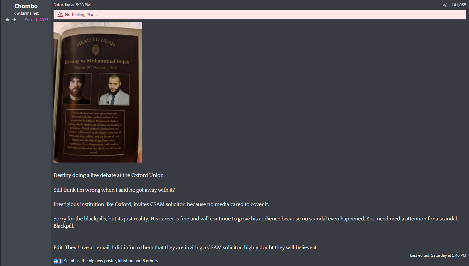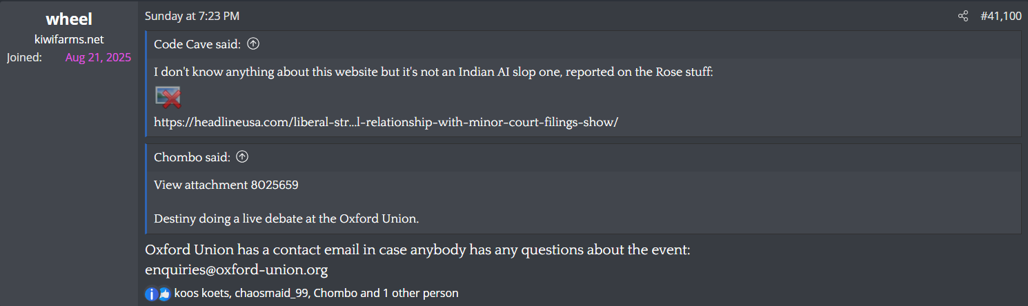 Kiwifarms users again signal to each other to contact media personalities about Destiny, explicitly against Josh's warning a few days ago.