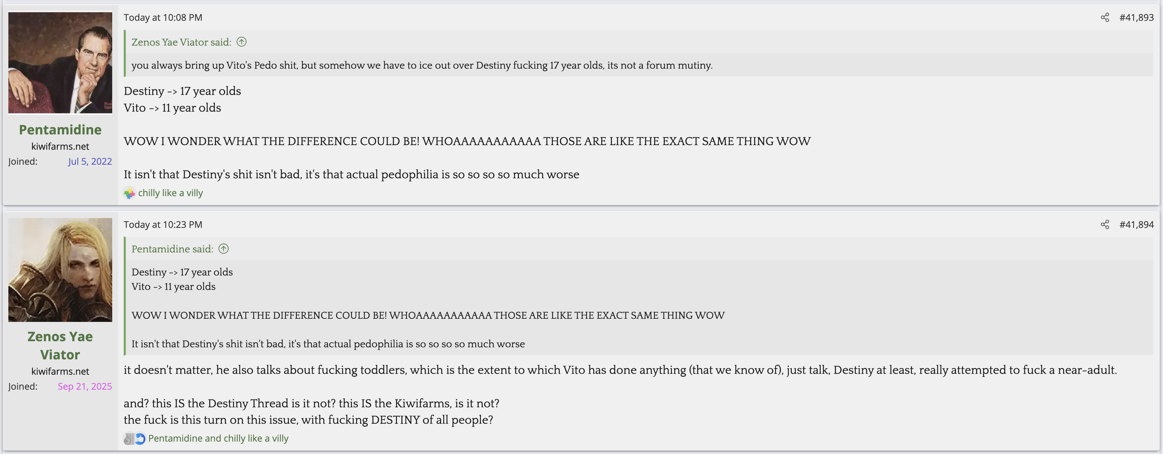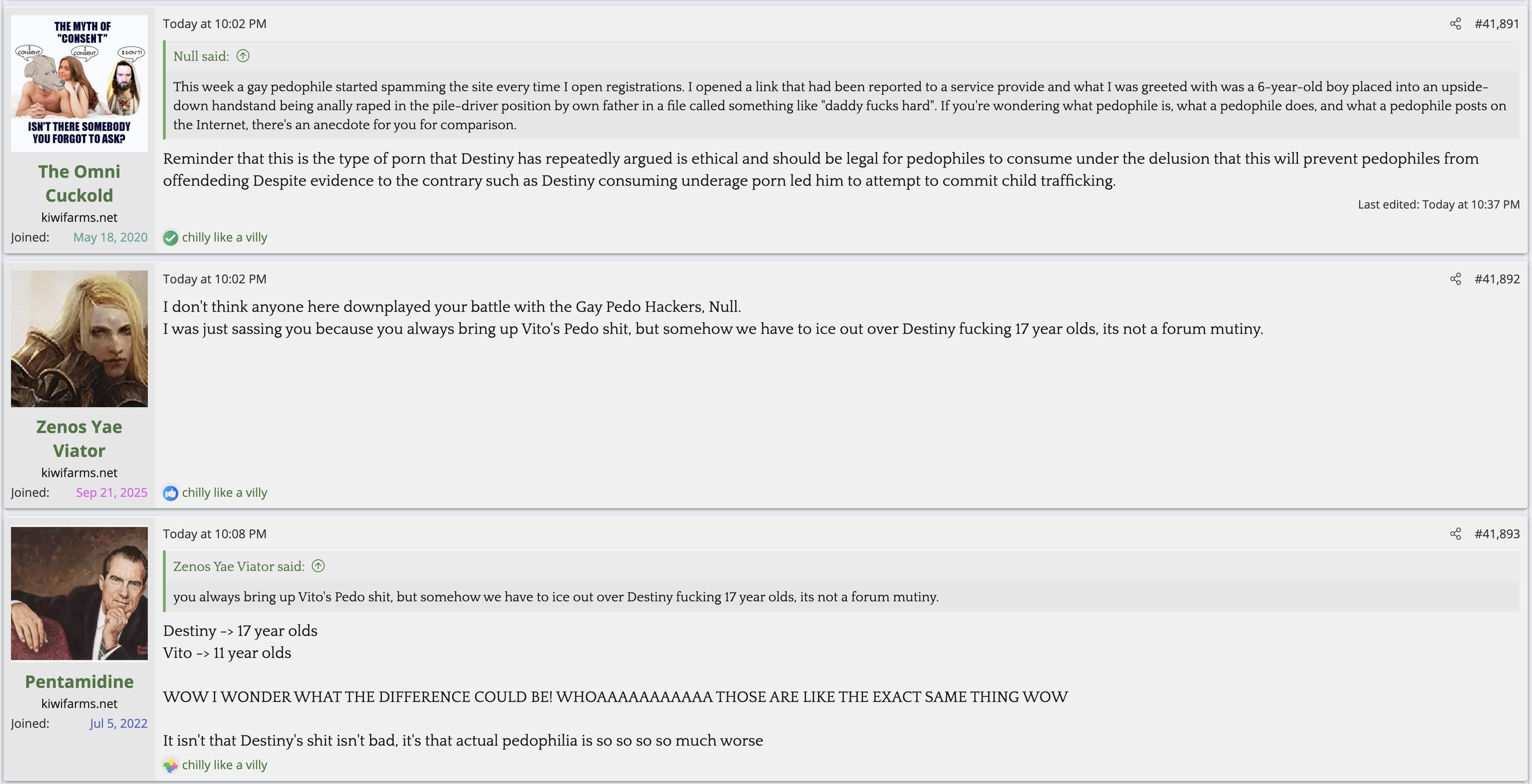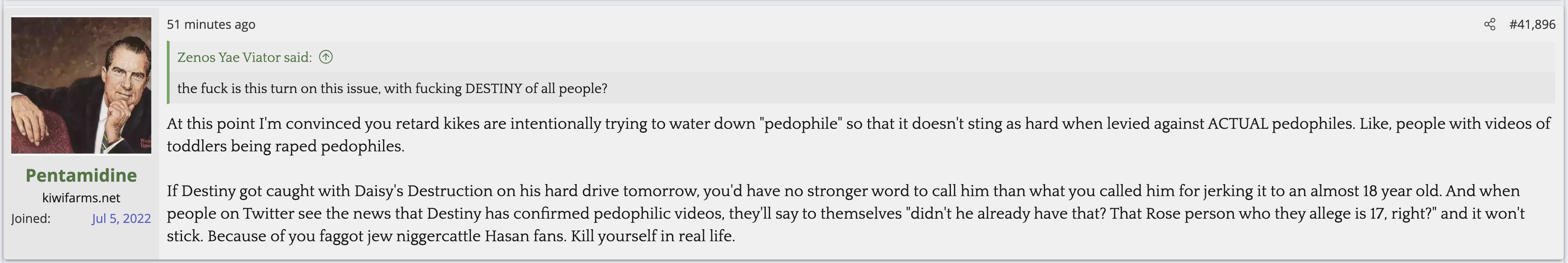 Without mentioning Josh's stupid idea to lock the Destiny thread, Kiwifarms user Pentamidine comes to Josh's defense over his "principle" to ONLY call people pedophiles if they're attracted to women below the age of 10.Josh unlocked the thread after less than half a day over some ribbing meanwhile the Metokur thread, which is filled with on-topic discussion, remains locked. He dares the thread's posters to keep pushing him. They will and he won't do anything about it. He won't do anything about celebrating child rape, he won't do anything about open flagging and gayops, and a little over a week ago he flat out admitted he won't be moderating the Destiny thread at all.View attachment 102569