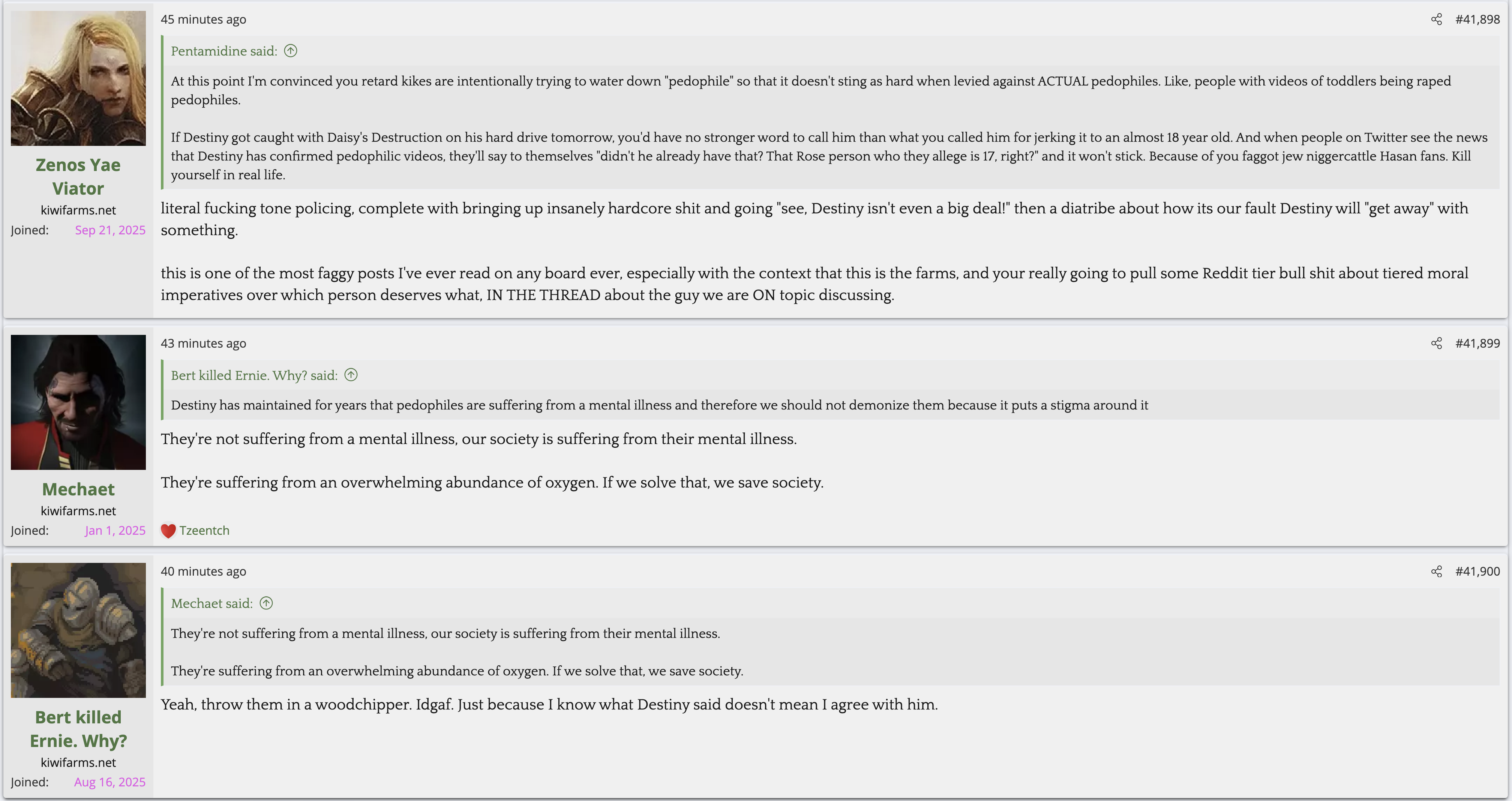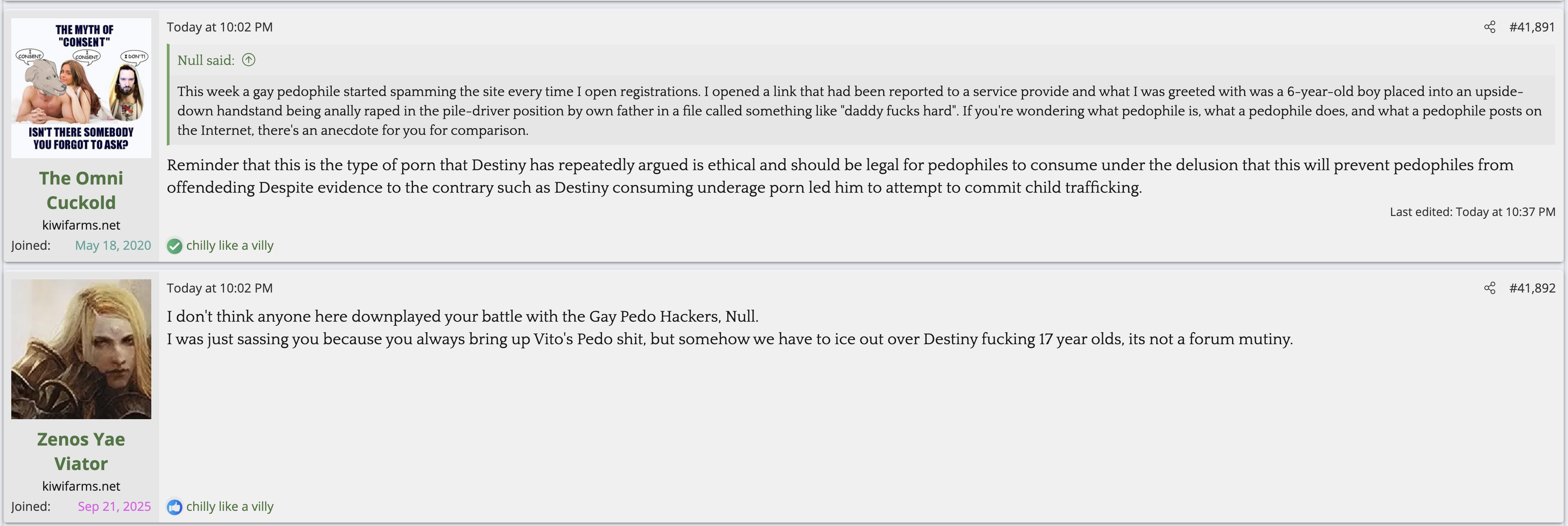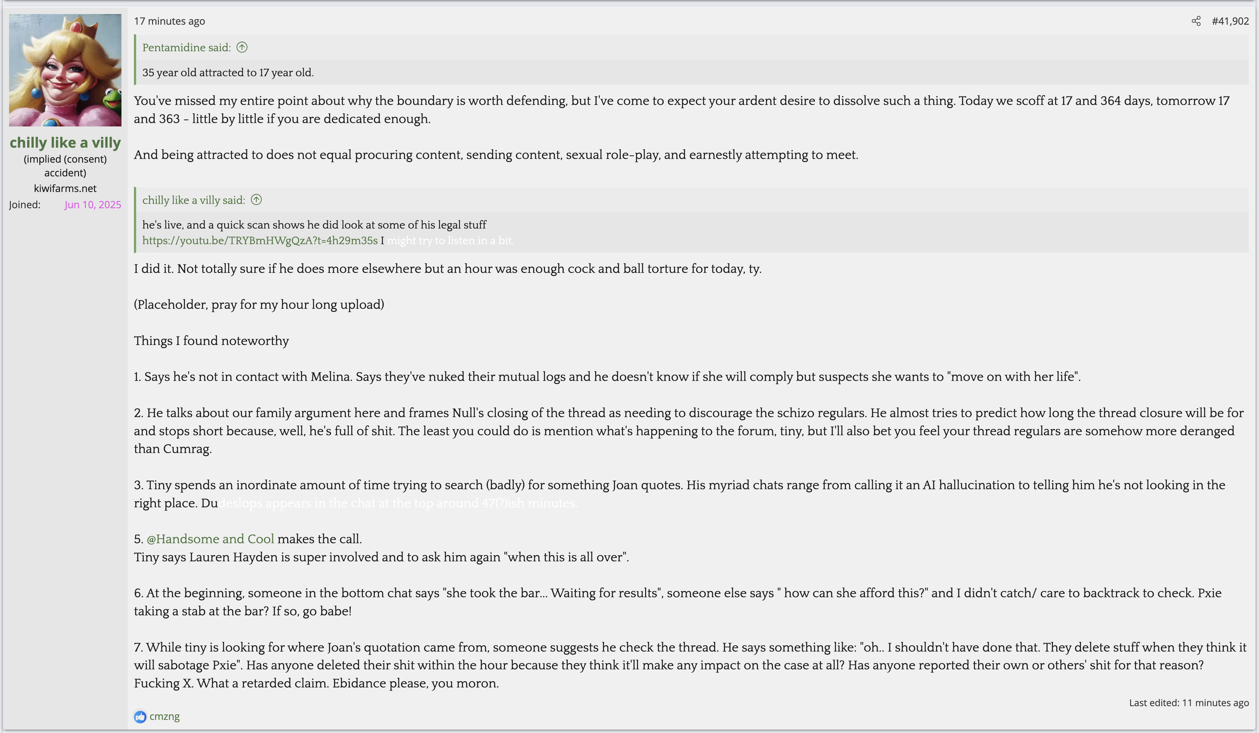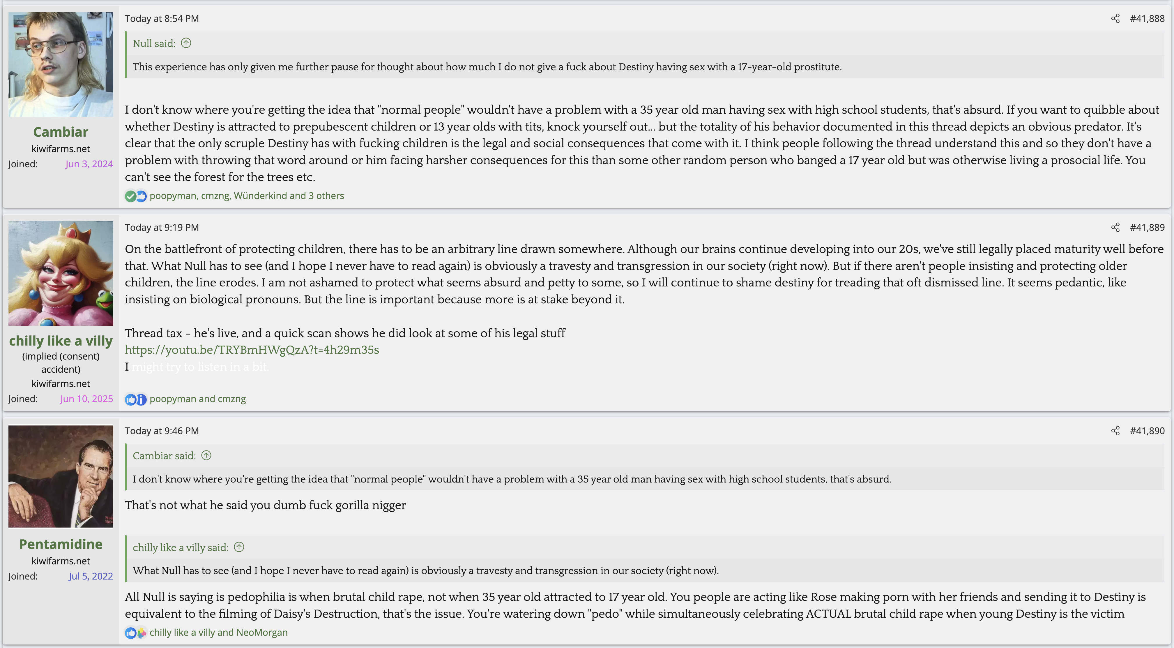 Without mentioning Josh's stupid idea to lock the Destiny thread, Kiwifarms user Pentamidine comes to Josh's defense over his "principle" to ONLY call people pedophiles if they're attracted to women below the age of 10.Josh unlocked the thread after less than half a day over some ribbing meanwhile the Metokur thread, which is filled with on-topic discussion, remains locked. He dares the thread's posters to keep pushing him. They will and he won't do anything about it. He won't do anything about celebrating child rape, he won't do anything about open flagging and gayops, and a little over a week ago he flat out admitted he won't be moderating the Destiny thread at all.View attachment 102569