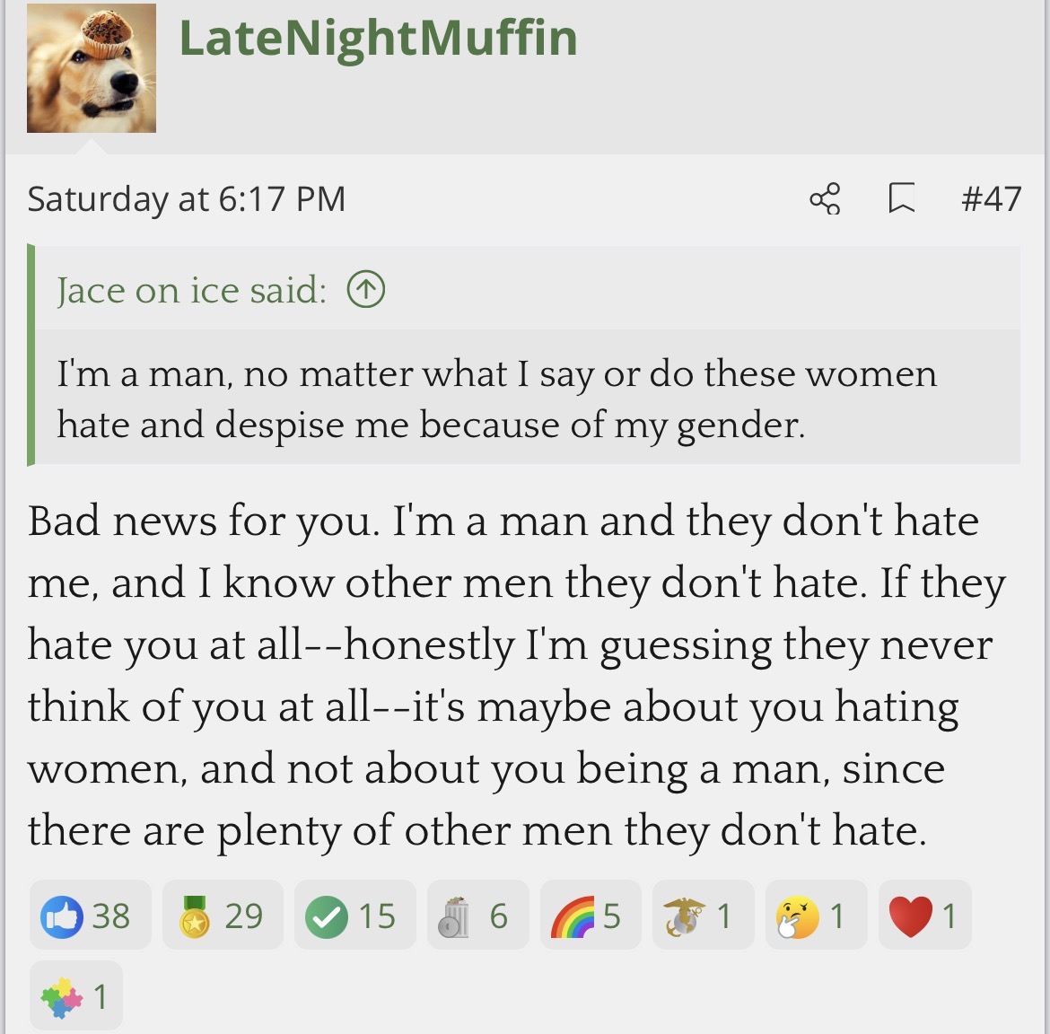 >Bad news for you. I'm a man and they don't hate me, and I know other men they don't hate. If they hate you at all--honestly I'm guessing they never think of you at all--it's maybe about you hating women, and not about you being a man, since there are plenty of other men they don't hate.