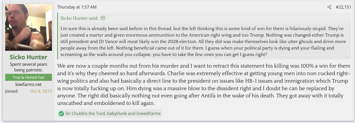 A crackdown on groups like Antifa, the CEO's of social media sites banning people who cheered on the killing, etc. Literally anything other than what ended up happening. I think most of the dooming you'll see in online right spaces now is downstream of the fact that Trump couldn't even keep Jimmy Kimmel off the air for a full week.What did these losers want to happen in the exactly? Tens of thousands of people in the aftermath have joined TPUSA. Anything "result" from the assassination won't be felt for many years when these people go up in the ranks and start engaging in politics.