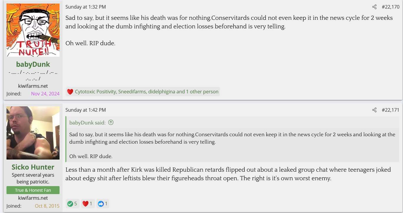 The Charlie Kirk thread has now hit the acceptance stage of mourning and are acknowledging Kirk's murder meant and did nothing and the left bitchslapped them hard by doing it.
