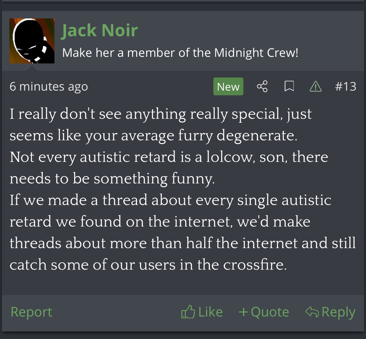 For context, Kengle was maintaining a thread about me in a hidden forum. I mentioned it to him this morning, pointed out the implicit threat of moving it to "the freezer" as he calls it instead of deleting it. A couple of hours ago I broached the subject again and he started in with his retarded robot HR talk. After pressing it a few more times, be hit me with "Oh you mean your megathread in the hidden forum? Is that the thread you mean?" So I said fuck him.